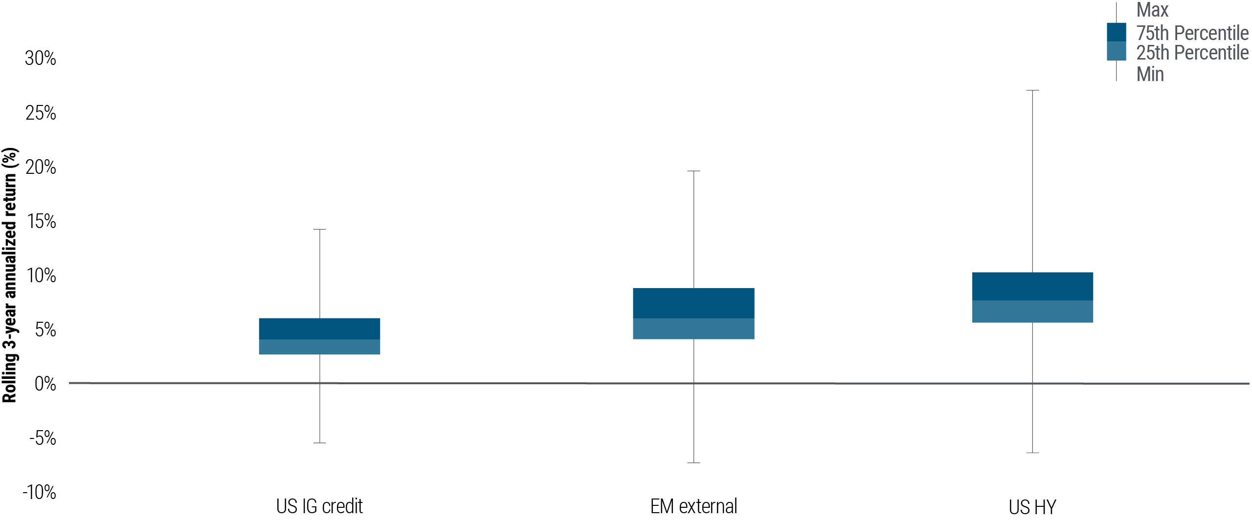 Source: Bloomberg and PIMCO as of 29 February 2024. Chart shows rolling 3-year annualized returns starting monthly from 31 December 2005 through 29 February 2024. Past performance is not a guarantee or a reliable indicator of future results. U.S. investment grade (IG) credit is represented using the Bloomberg US Credit Index; U.S. high yield (HY) is represented by the Bloomberg US Corporate High Yield Index; EM External is represented by the JP Morgan EMBI Global Diversified Composite Index. Note EM external is roughly 60% IG rated and 40% high yield rated.