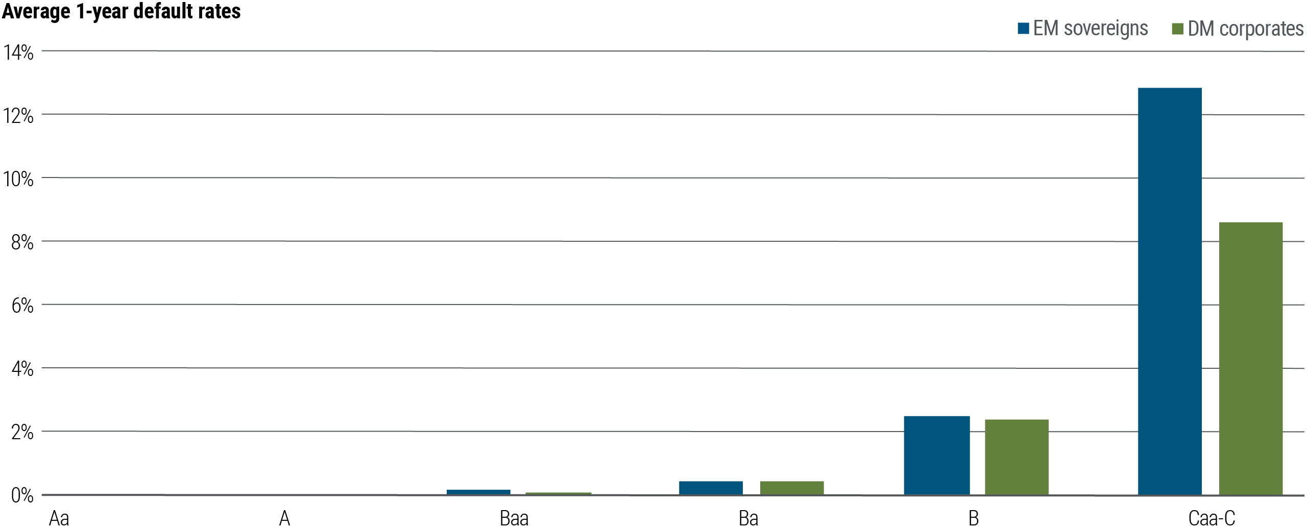 Figure 3: EM default distribution resembles corporate issuers at higher credit rating levels