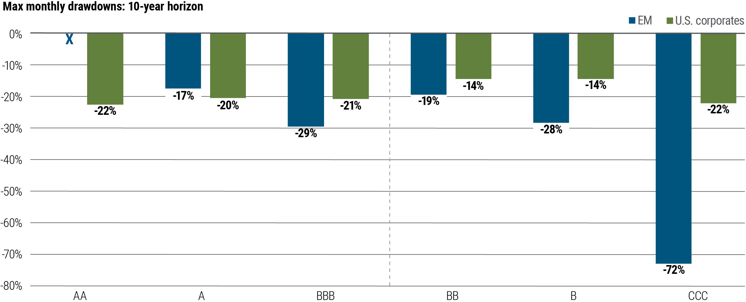 Figure 4: EM drawdowns have been deeper at lower rating levels
