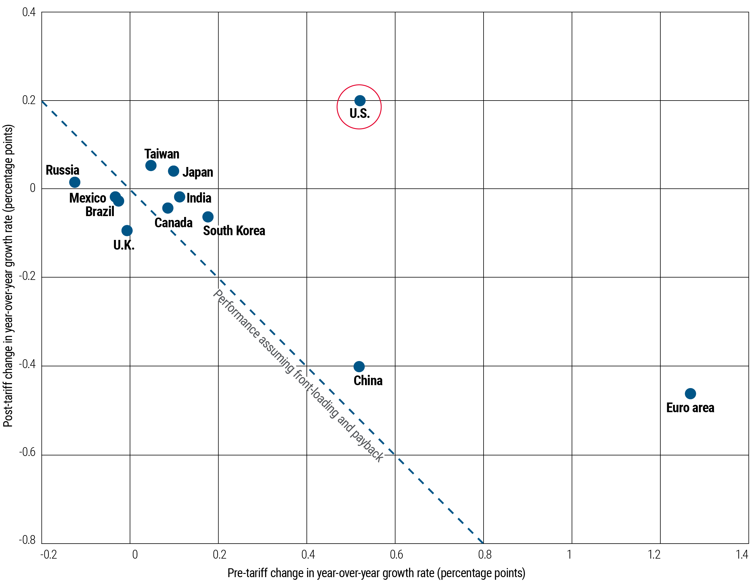 Source: Various national statistical agencies, Haver Analytics, and PIMCO calculations as of September 2025. See note below Figure 1 for details on PIMCO Global IP data. Pre- and post-tariff changes are based on the contribution of the region to global year-over-year growth rates. Pre-tariff change is November 2024 to March 2025; post-tariff change is March 2025 to September 2025.