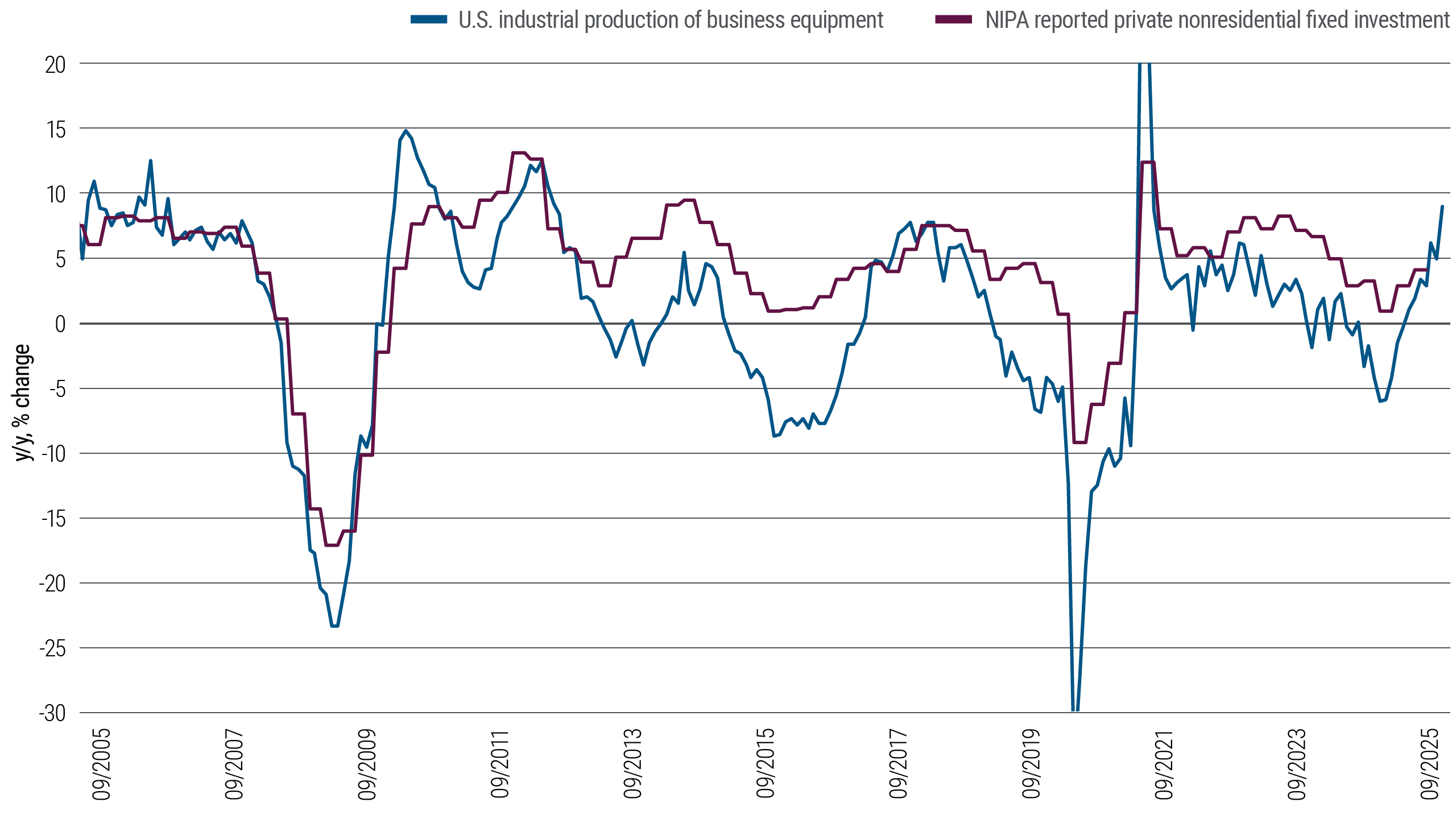 U.S. industrial production has also rebounded after a multi-year slump, largely thanks to technology and related products. Moreover, recent U.S. industrial production trends suggest that business fixed investment may have broadened into other equipment categories in the latter half of 2025, even as AI-related spending remains strong (see Figure 5).