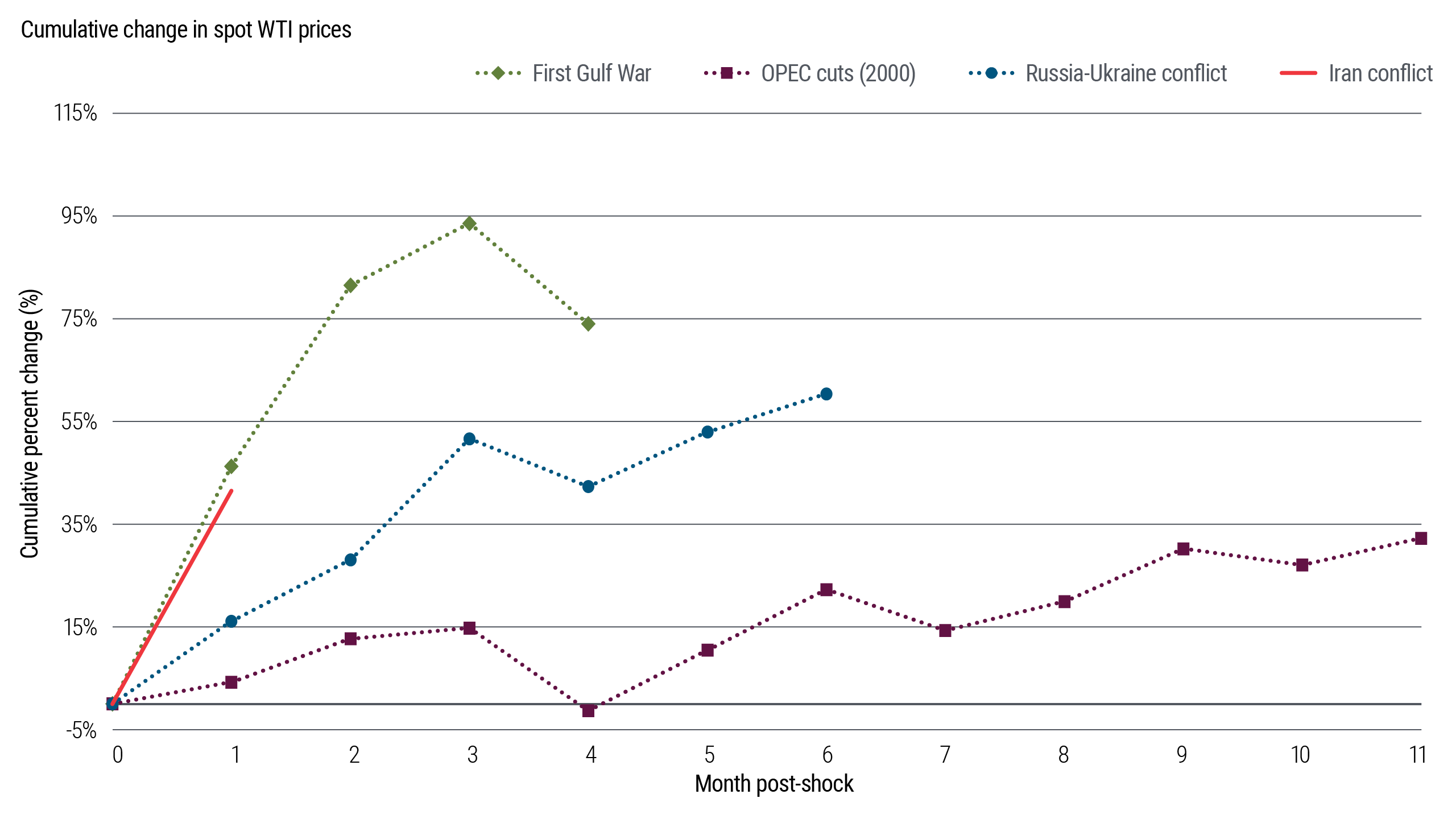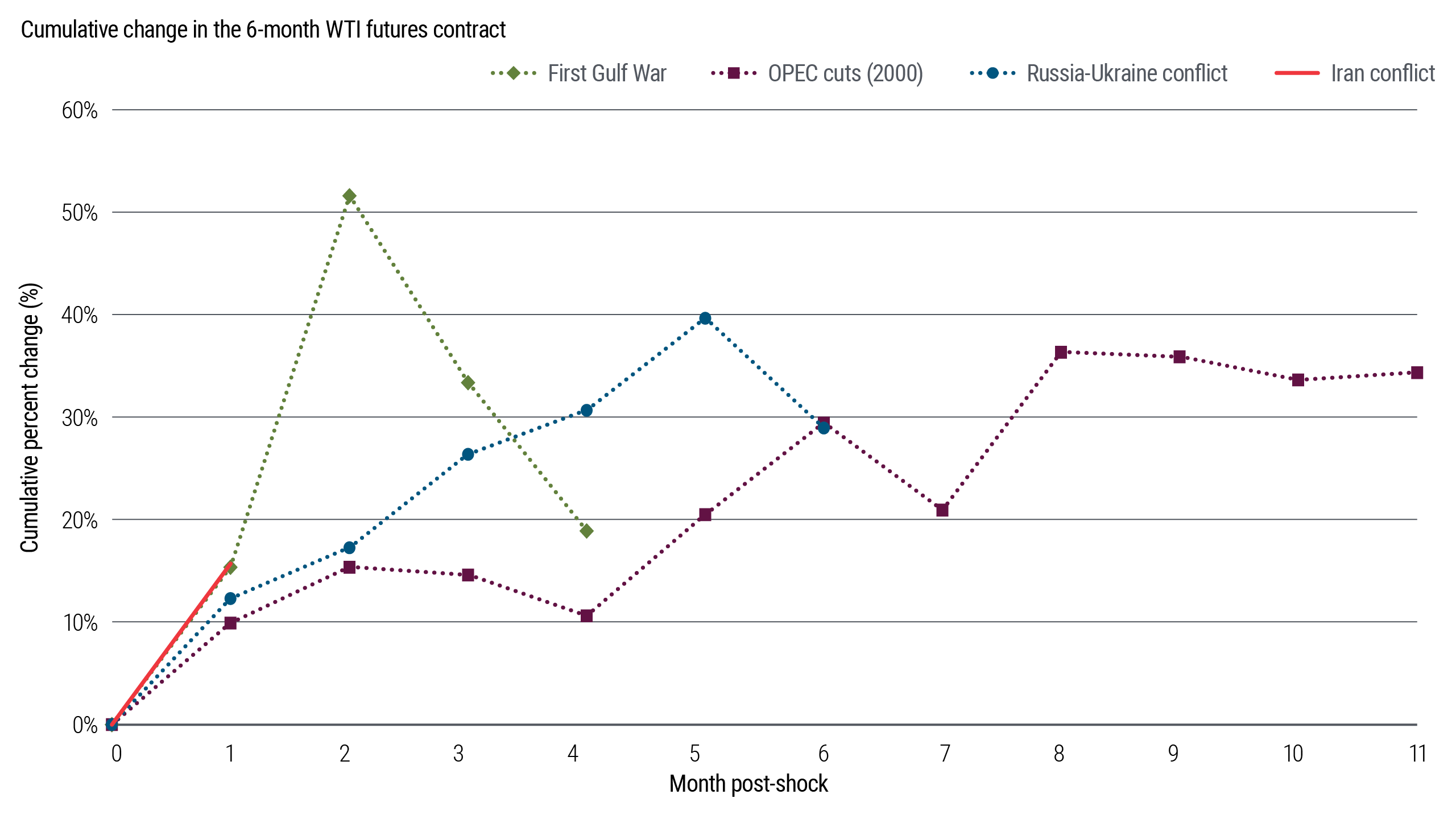 History is blunt on this point: It’s not the oil spike that breaks risk appetite, it’s how long it sticks around. Figures 1 and 2 illustrate this pattern by comparing cumulative changes in spot and six‑month crude futures across the four major oil supply shocks of the past four decades: the 1990 Gulf War, the 2000 OPEC production cuts, the 2022 Russia–Ukraine conflict, and the current Middle East war. Just over a month into the current episode, both spot and six-month futures have tracked a path remarkably similar to the early phase of the 1990 Gulf War.