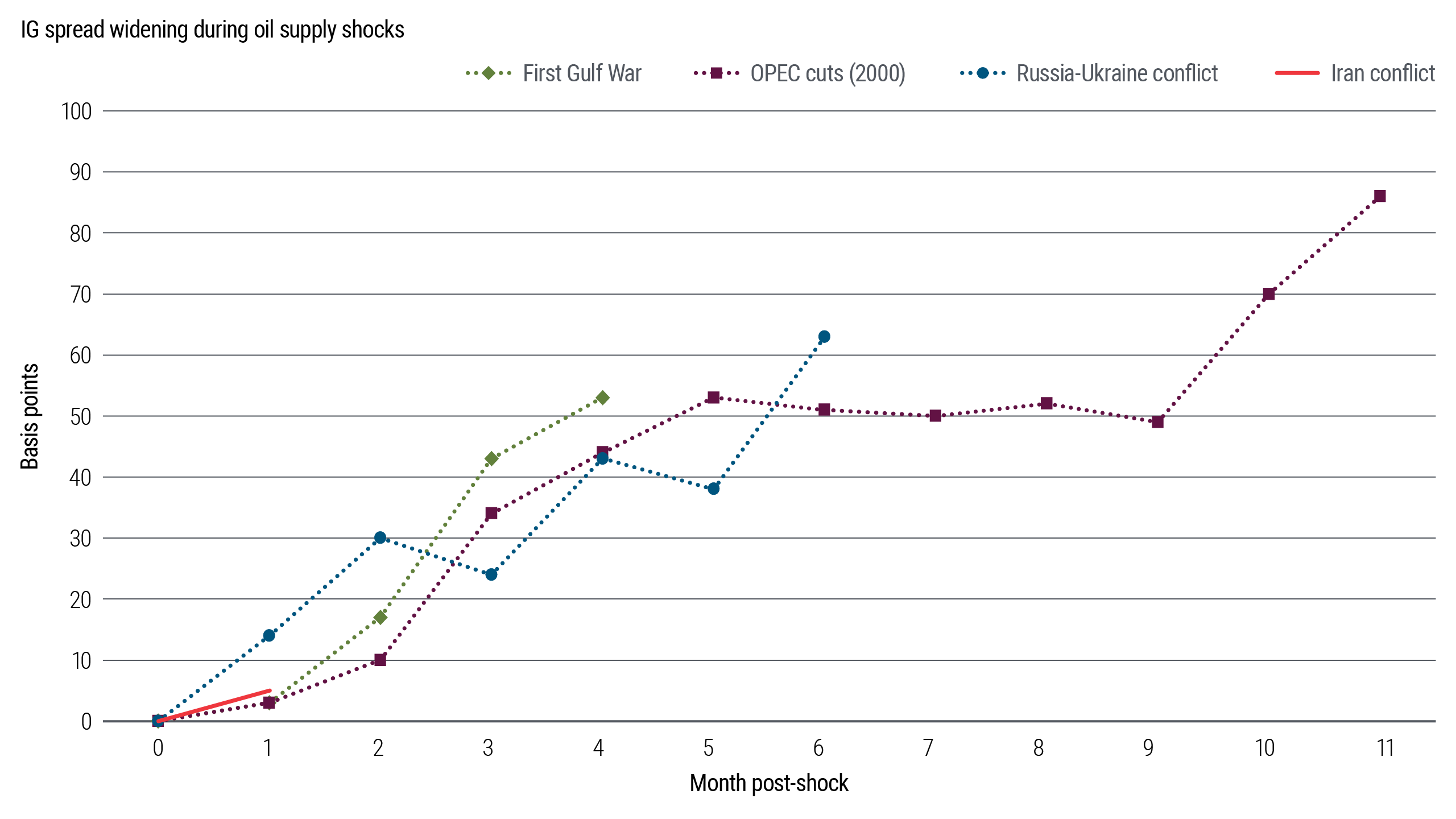 • Oil shocks tend to matter if they persist. History suggests markets reprice risk not on the initial spike in prices, but when elevated energy costs linger long enough to tighten financial conditions.