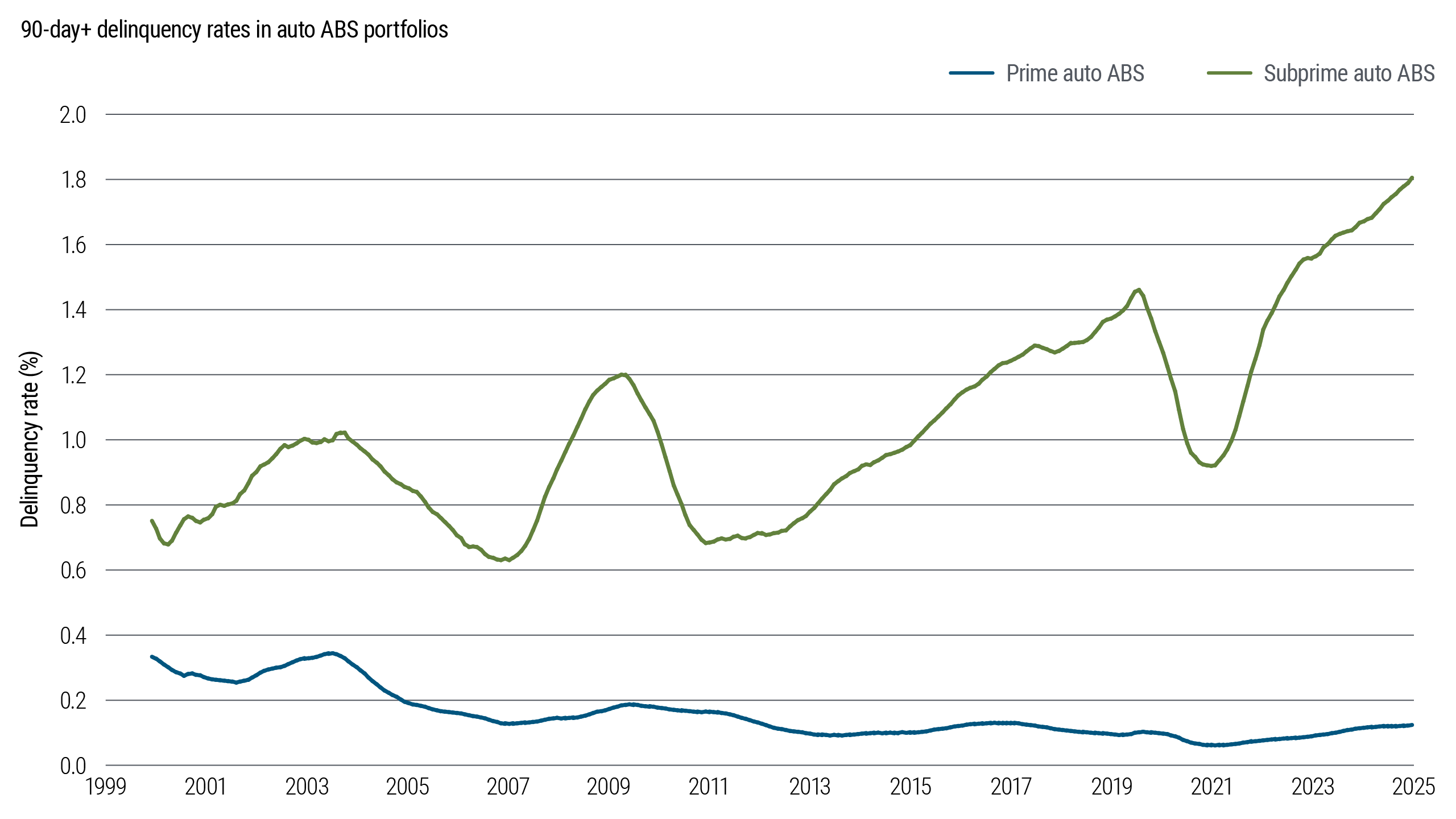 Nowhere is this more apparent than in the auto loan market, where asset-backed securities (ABS) data indicate that the rise in delinquencies has been driven almost entirely by subprime borrowers (see Figure 5). At the start of the year, consensus economic expectations centered on stronger growth, easing inflation, and lower monetary policy rates helping to relieve pressure on subprime borrowers. The current backdrop challenges that narrative, leaving lower‑income households even more exposed.