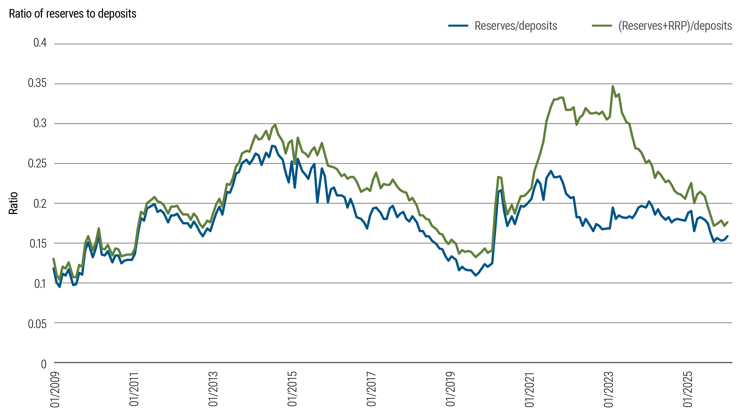 Source: Haver Analytics, Federal Reserve, PIMCO calculations as of 28 February 2026. RRP = reverse repurchase agreements.