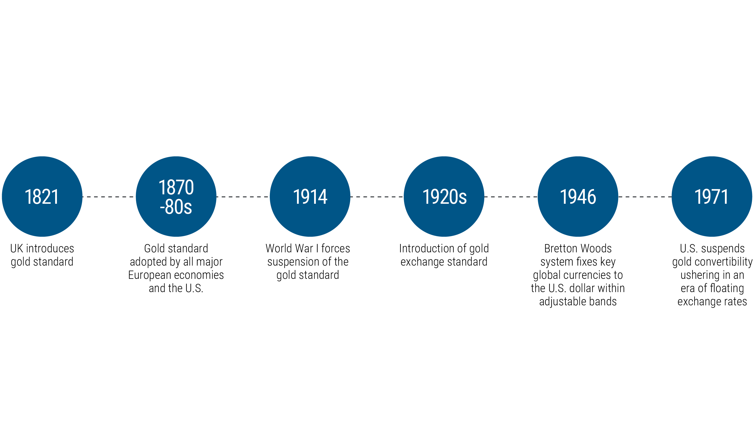 In times of war or crisis, maintaining sufficient gold reserve levels was difficult. During World War I, many countries had to abandon the gold standard. In the late 1920s, the “gold exchange standard” was introduced, which allowed the exchange of a local currency for gold or for other currencies that were still backed by gold, such as the British pound and the U.S. dollar. Thus, the first “reserve currencies” were born. However, the economic crisis that began in 1929 took its toll; in 1931, the United Kingdom suspended the gold standard and many other countries followed.