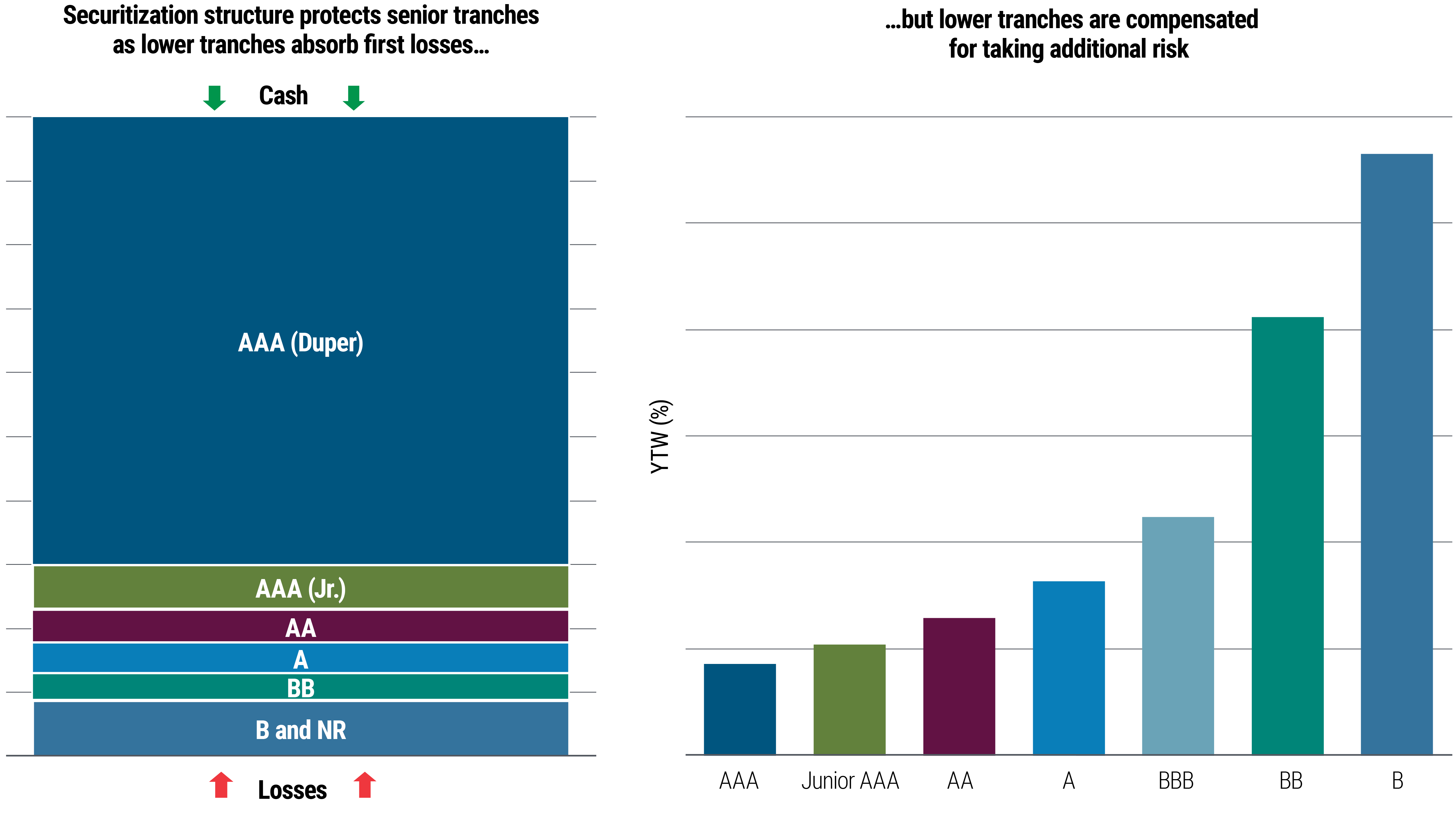 As shown in the left chart below, the securitization structure is designed to protect senior tranches (those with credit ratings of AAA, AAA (Jr.), AA, A, and BBB) from losses. However, junior tranches (those with credit ratings of BB and B) are compensated for taking additional risk, as shown in the chart below on the right.
