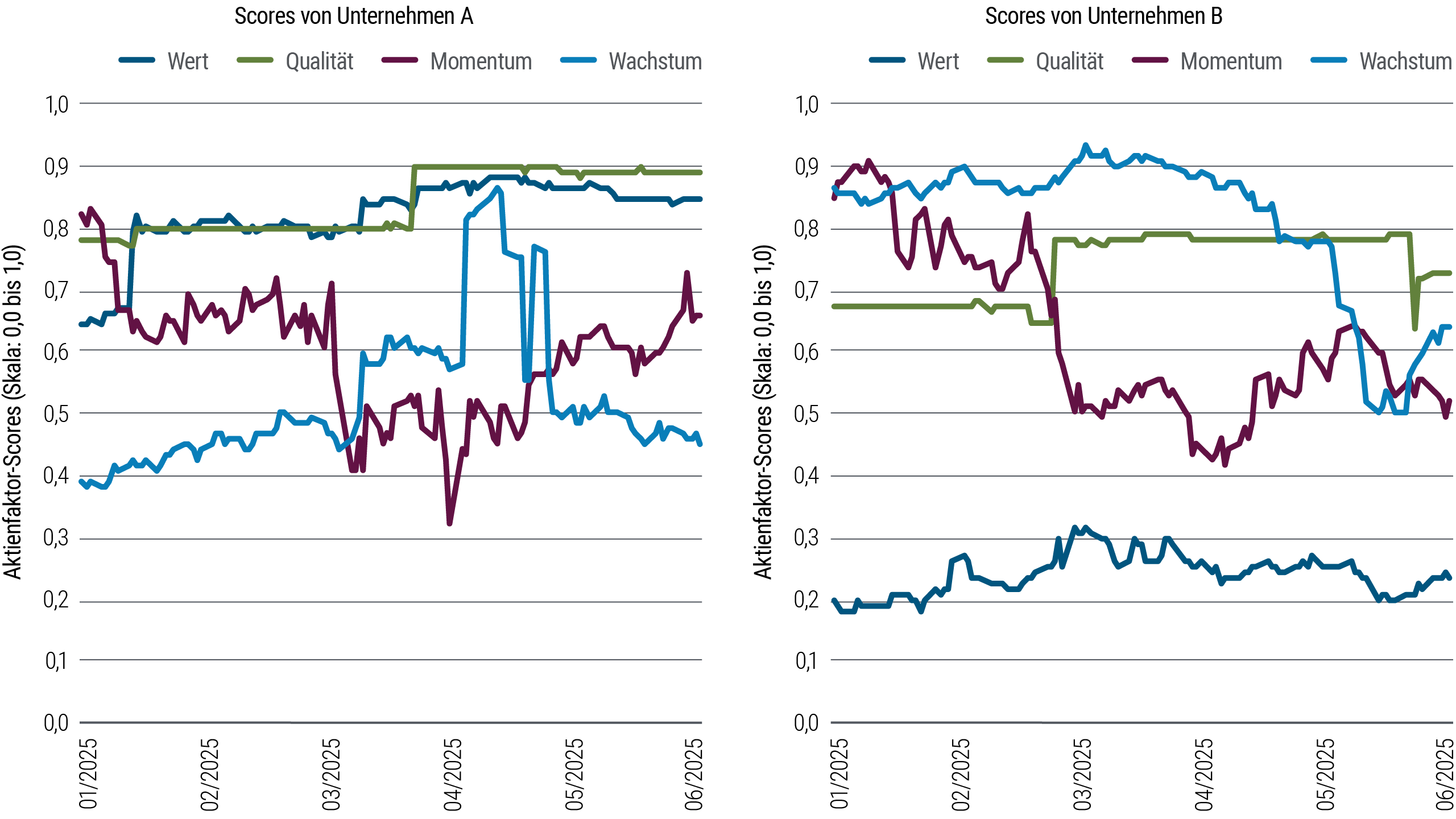 Quelle: Berechnungen von PIMCO; Stand: 9. Juni 2025. Die Scores werden auf einer Skala von 0,0 bis 1,0 angegeben. Diese beispielhaften Aktienfaktor-Scores von PIMCO werden seit Jahresbeginn täglich für zwei US-Unternehmen aus dem Technologiesektor erfasst. Unternehmen A weist eine solide Bilanz auf, ist auf den Binnenmarkt ausgerichtet, wird zu günstigen Bewertungen gehandelt und verzeichnete nach den US-Zollankündigungen ein stärkeres Wachstum und eine rasante Erholung. Unternehmen B wurde mit höheren Bewertungen gehandelt und ist stärker auf den Welthandel ausgerichtet, weswegen seine Wachstumsprognosen und -dynamik durch das unsichere Handelsumfeld belastet wurden.