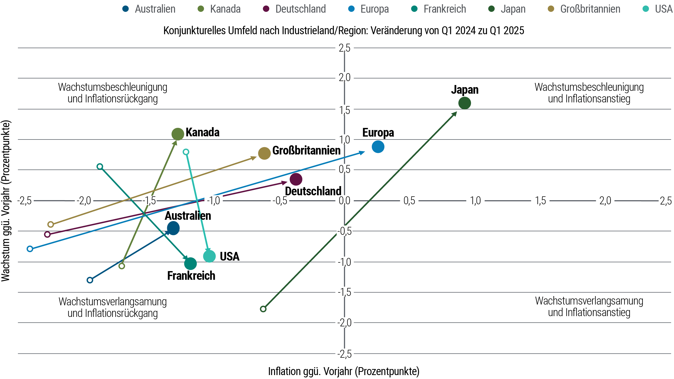 Quelle: Daten von Haver Analytics und Berechnungen von PIMCO; Stand: 9. Juni 2025. Dieser Abbildung liegen die BIP- und VPI-Daten der einzelnen Länder bzw. Regionen zugrunde. Die veränderte Situation im Vergleich zum Vorjahr wird jeweils als großer Punkt im Koordinatensystem dargestellt. Außerdem wird die Situation der einzelnen Länder vor einem Jahr (als hohler Kreis) dargestellt.