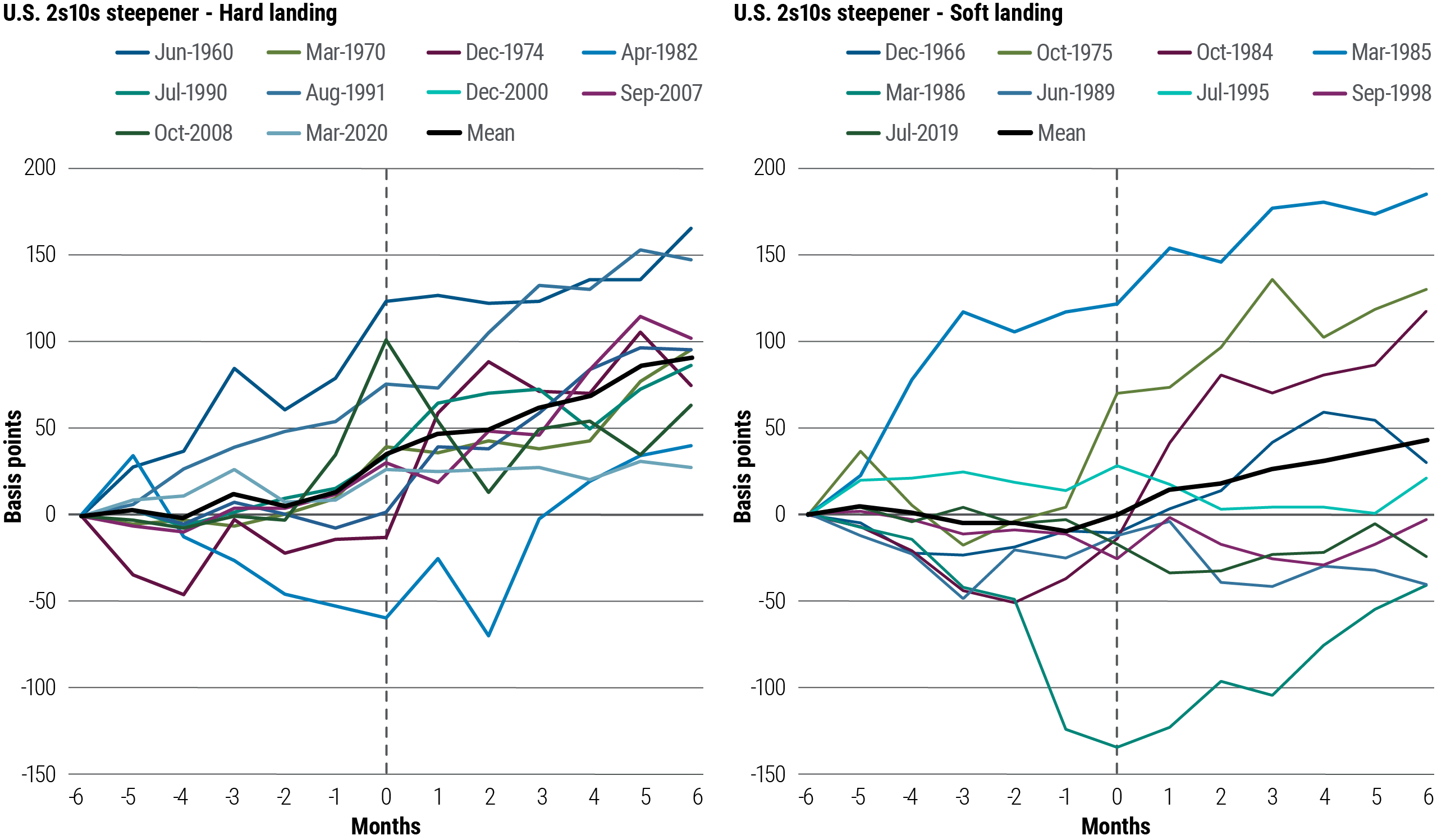 Historisch betrachtet entwickelten sich die Märkte unterschiedlich, je nachdem, ob Zinsschritte in Zeiten erheblicher konjunktureller Abkühlung (Szenario einer harten Landung) oder unter gemäßigteren Bedingungen (weiche Landung) vorgenommen wurden. Hierzu einige Beispiele: