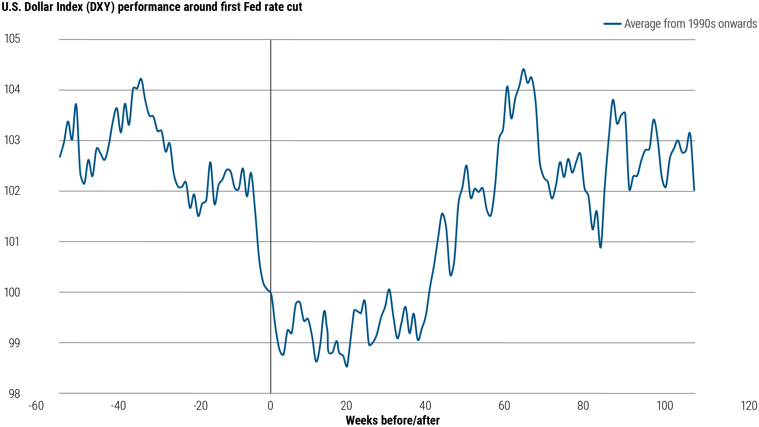 Beim US-Dollar ging es tendenziell bergab, zumindest vorübergehend. In früheren Lockerungszyklen, bei denen es sowohl zu harten als auch zu sanften Landungen kam, tendierte der US-Dollar unter dem Strich dazu, zunächst abzuwerten, sich in den Monaten nach der ersten Zinssenkung aber wieder zu erholen (siehe Abbildung 3). Wir halten es für denkbar, dass der Greenback seinen Status als renditestarke Währung verliert, wenn sich die Geldpolitik normalisiert, was eine moderate Abwertung zur Folge haben könnte.