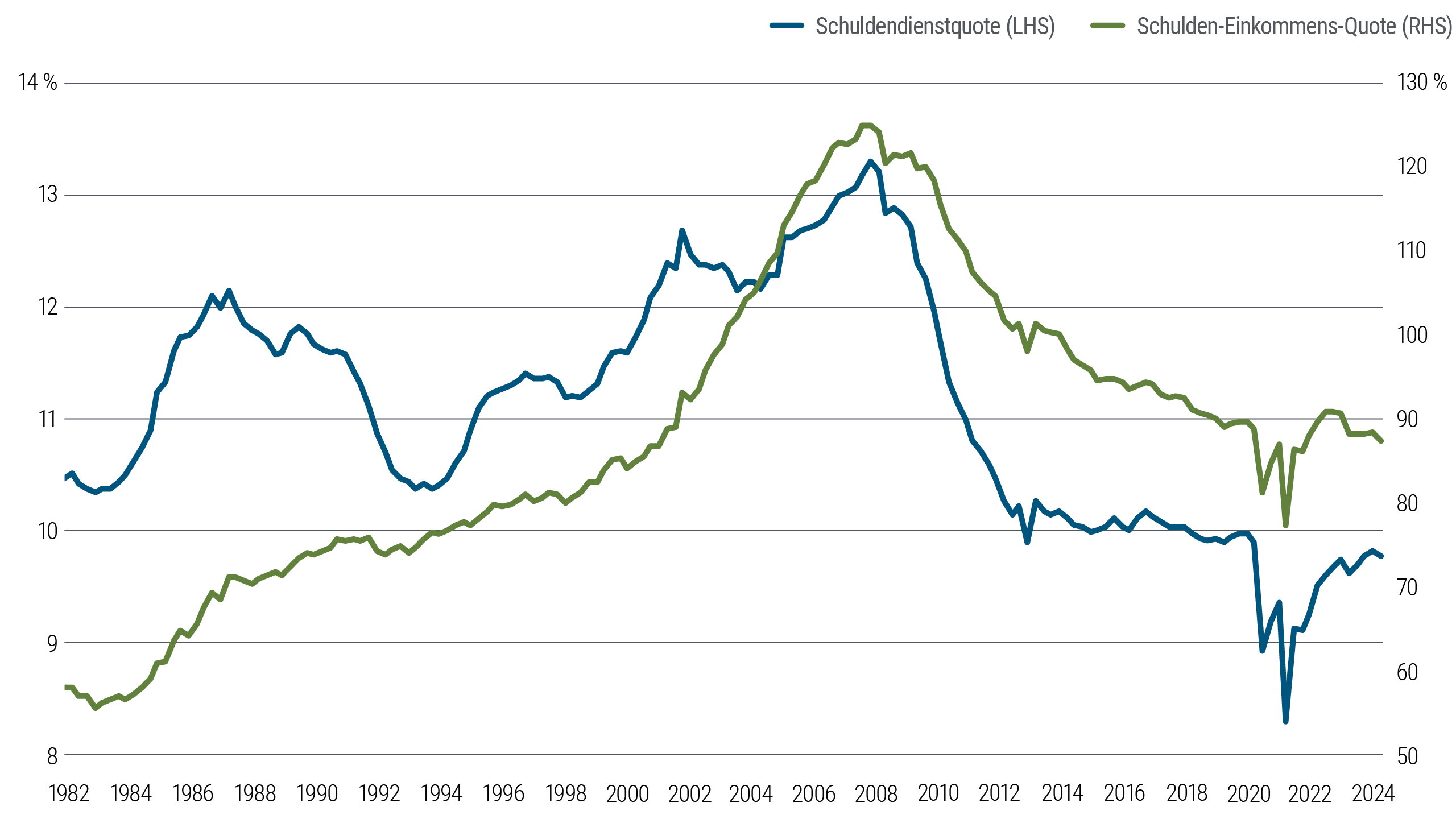 - US-Verbraucherkredite: Verbraucherkredite jenseits der Hypotheken für Wohnimmobilien stellen mit einem Volumen von mehr als 17 Billionen US-Dollar – einschließlich Privatkredite, Studentenkredite und Kreditkartenforderungen – eine beträchtliche Investment-Chance dar. Trotz höherer Zinssätze sind die Bilanzen der privaten Haushalte nach wie vor robust, wobei das Verhältnis von Schulden zu Einkommen in den vergangenen Jahren gesunken ist und das Nettovermögen in der Nähe des Allzeithochs liegt (siehe Abbildung 2). Die Kosten für den Schuldendienst sind im historischen Vergleich nach wie vor niedrig, vor allem deshalb, weil etwa 95 Prozent der US-amerikanischen Hypotheken festverzinslich sind.