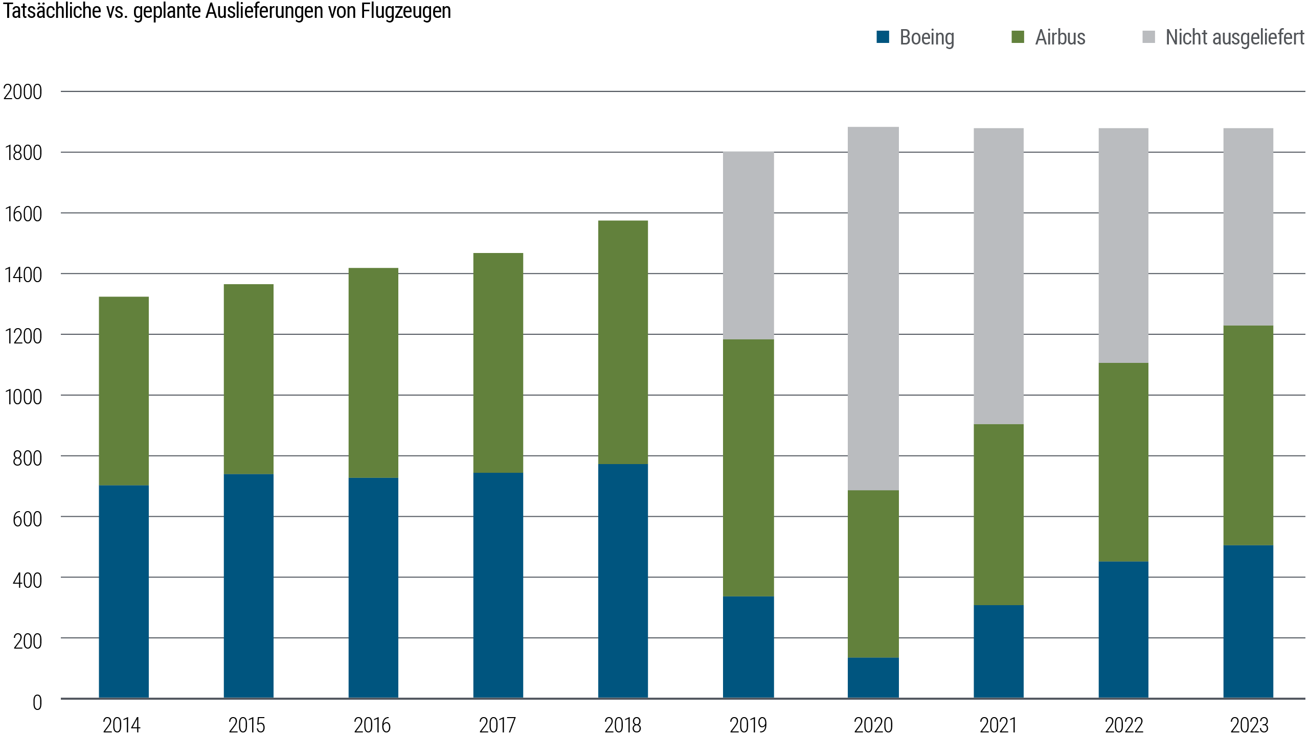 - Flugzeugfinanzierungen: Der Kapitalbedarf in diesem Sektor nimmt weiter zu. Die Hindernisse für die Beschaffung und Bedienung der zugrunde liegenden Sicherheiten sind nach wie vor hoch, während die Sicherheiten selbst starke Fundamentaldaten aufweisen. Die Luftfahrtindustrie war durch die Pandemie und den Russland-Ukraine-Konflikt mit erheblichen Herausforderungen konfrontiert. Nach der Aufnahme von 250 Milliarden US-Dollar an zusätzlichen Schulden kehrten die Fluggesellschaften jedoch im Jahr 2023 in die Gewinnzone zurück, indem sie sich auf Kostensenkungen und den Ausbau der Flottenkapazität konzentrierten, um der steigenden Nachfrage nach Flugreisen gerecht zu werden, wobei die Passagierkilometer (RPKs) das Niveau vor Covid inzwischen übertreffen. Produktionsprobleme und ein anhaltender Lieferrückstand beim Bau von Flugzeugen haben die Verfügbarkeit neuer Flugzeuge eingeschränkt, wobei die Erstausrüster 35 Prozent weniger Flugzeuge (4200 Maschinen) auslieferten, als von 2019 bis 2023 bestellt worden waren (siehe Abbildung 3). Angesichts des zunehmenden Ungleichgewichts zwischen Angebot und Nachfrage glauben wir, dass die Leasingraten für neue und mittelgroße Flugzeuge ein attraktives Rendite- und Ertragspotenzial bieten (für weitere Informationen siehe „Aviation Finance: Capturing Opportunities in Private Credit“).