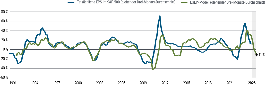 Der nächste Punkt: Wir glauben, dass die Schätzungen für die Unternehmensgewinne weltweit nach wie vor zu hoch sind und nach unten revidiert werden – immer mehr Firmen müssen die sich verschlechternden Fundamentaldaten zur Kenntnis nehmen. Zum Zeitpunkt der Erstellung dieses Artikels liegt die Konsensschätzung von Bloomberg für das Gewinnwachstum 2023 im S&P 500 bei sechs Prozent (acht Prozent ohne den Energiesektor). Darüber hinaus geht mit den Konsensschätzungen die Erwartung einer Ausweitung der Gewinnmargen einher, obwohl sich Umsatz und Nachfrage wahrscheinlich abkühlen werden, während die Kosten hoch bleiben. Bloombergs Konsensschätzungen für das Gewinnwachstum stehen im Gegensatz zu dem Negativwachstum von minus elf Prozent, das der Earnings Growth Leading Indicator (EGLI) von PIMCO vorschlägt – siehe Abbildung 1. In der Vergangenheit sind die Schätzungen für den Gewinn pro Aktie (EPS) während einer Rezession durchschnittlich um 15 Prozent zurückgegangen. Dies würde darauf hindeuten, dass eine nur leichte Rezession einen geringeren Rückgang verursachen könnte – ungefähr im mittleren einstelligen Prozentbereich. Zusammenfassend lässt sich sagen: Wir würden uns erst dann für ein Frühzyklus-Umfeld über Anlageklassen hinweg positionieren, wenn sicher ist, dass sich die Zinsen stabilisieren und die Gewinne der Unternehmen wieder steigen. Nur dann würden wir bei risikoreicheren Assets einsteigen.