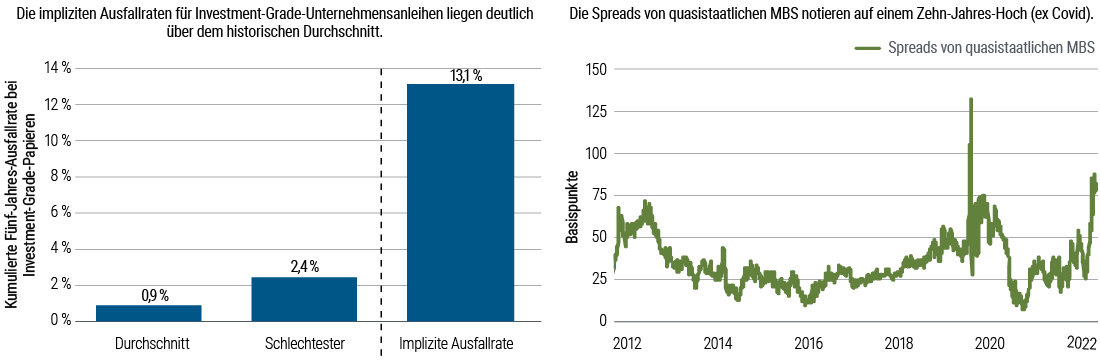 Neben dem höheren Renditepotenzial erscheinen festverzinsliche Wertpapiere auch im Kontext unseres makroökonomischen Ausblicks attraktiver. Abbildung 3 zeigt, dass die Bilanzen der privaten Haushalte und Unternehmen in den USA relativ gesund sind, insbesondere dann, wenn man die großen Spreads zwischen Investment-Grade-Anleihen und US-Staatsanleihen heranzieht. Diese Spreads implizieren eine Fünf-Jahres-Ausfallrate von 13 Prozent (unter Annahme einer Rückzahlungsquote von 40 Prozent), was deutlich über der schlechtesten realisierten Fünf-Jahres-Ausfallrate von 2,4 Prozent liegt. Die Spreads für quasistaatliche Mortgage-Backed Securities (MBS) aus den USA, die allgemein mit AAA bewertete Assets sind, weisen die höchsten Niveaus in den vergangenen zehn Jahren aus, wenn man einmal von der Liquiditätskrise im Jahr 2020 infolge der Pandemie absieht. Im Gegensatz dazu haben die Gewinnschätzungen bei Aktien das Risiko einer Rezession immer noch nicht eingepreist. Mit Blick in die Zukunft glauben wir, dass Investments in festverzinsliche Anlagen in einer Rezession tendenziell widerstandsfähig sind, weil die Zentralbanken in der Regel die Leitzinsen senken.