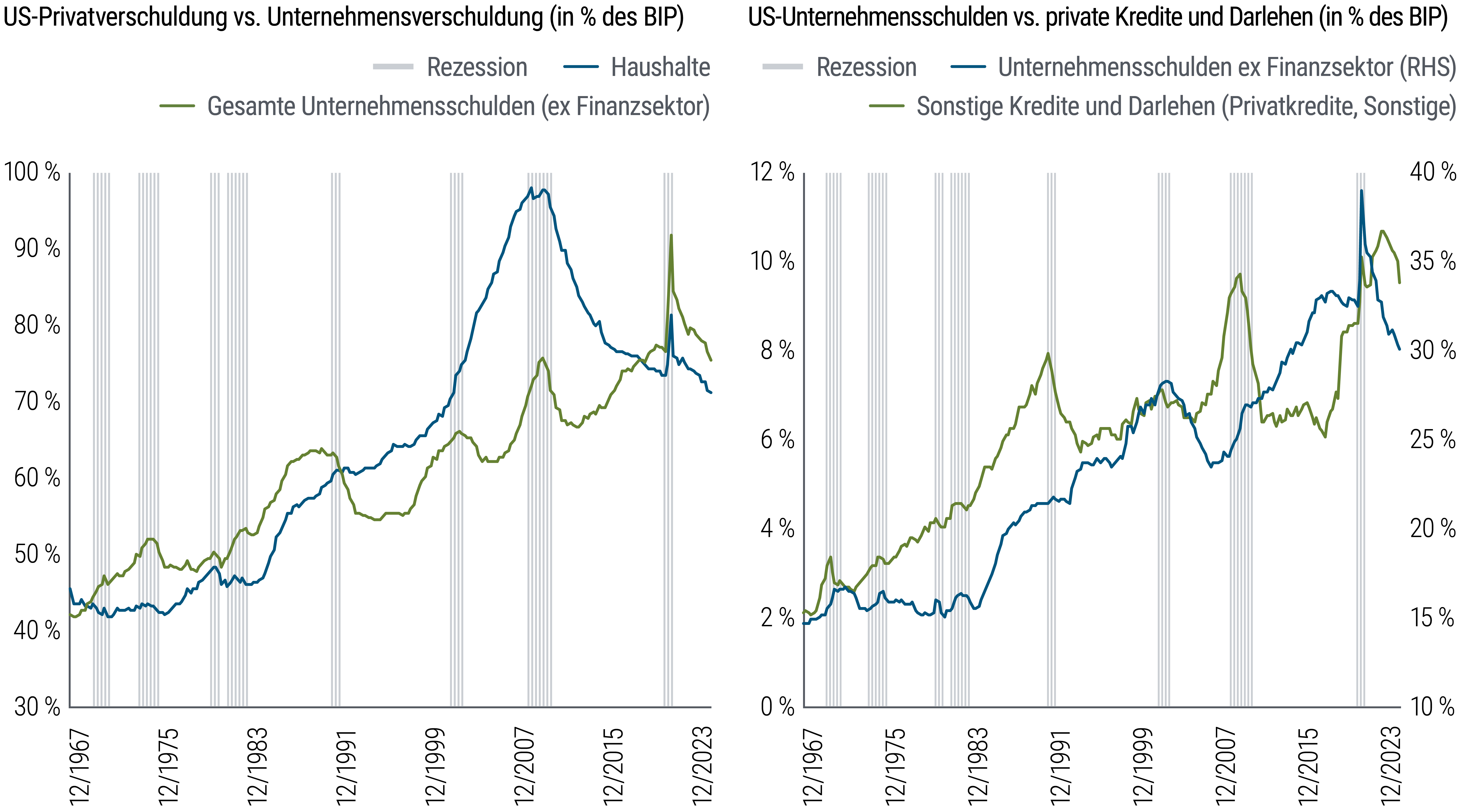 Dem stellen wir die Kapitalvolumina gegenüber, die derzeit in Unternehmenskrediten konzentriert sind. Wir sind sehr besorgt über das schnelle Wachstum an den privaten Märkten mit variablen Zinssätzen, die möglicherweise noch nicht durch frühere Zahlungsausfallzyklen auf die Probe gestellt worden sind. Diese Bedingungen erhöhen das Risiko, dass es in Bereichen wie Technologie und direkten Kreditgewährungen an Unternehmen mit hoher Verschuldung und niedrigerer Kreditwürdigkeit zu Exzessen kommt. Innerhalb unseres langfristigen Prognosehorizonts könnten solche Herausforderungen durchaus auftreten.