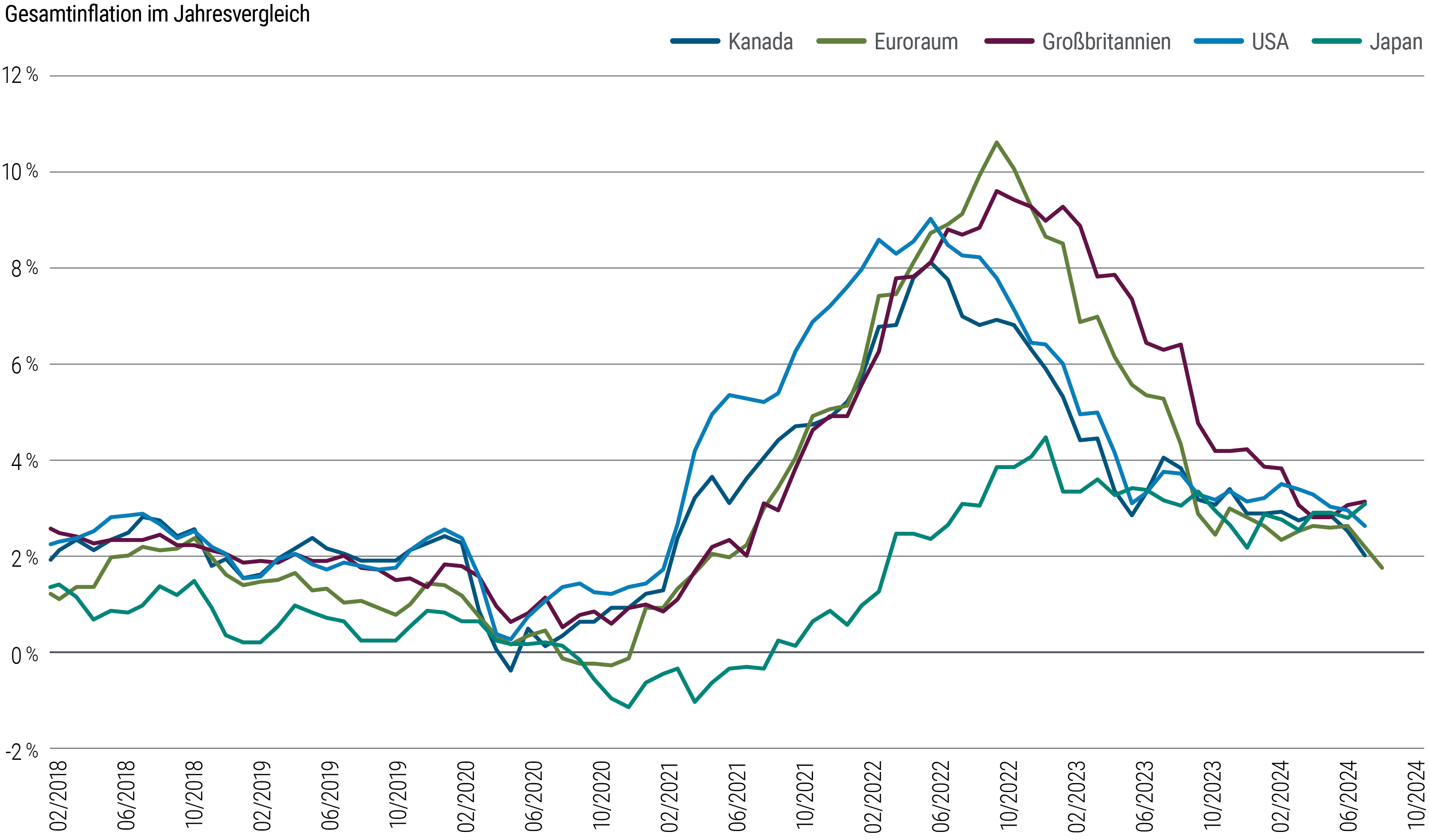 In den anderen Industrieländern deuten die schwächere Nachfrage, das Nachlassen des Lohndrucks an den Arbeitsmärkten und die am Markt gehandelten Inflationserwartungen ebenfalls auf eine nahe dem Zielwert liegende Inflation im Jahr 2025 hin. Bei den Volkswirtschaften der Industrieländer sticht Kanada in gewisser Weise hervor: Hier wird die Inflation am ehesten unter den Zielwerten liegen, während die Arbeitsmarkt-Indikatoren in Australien auf einen etwas langsameren Fortschritt hindeuten.