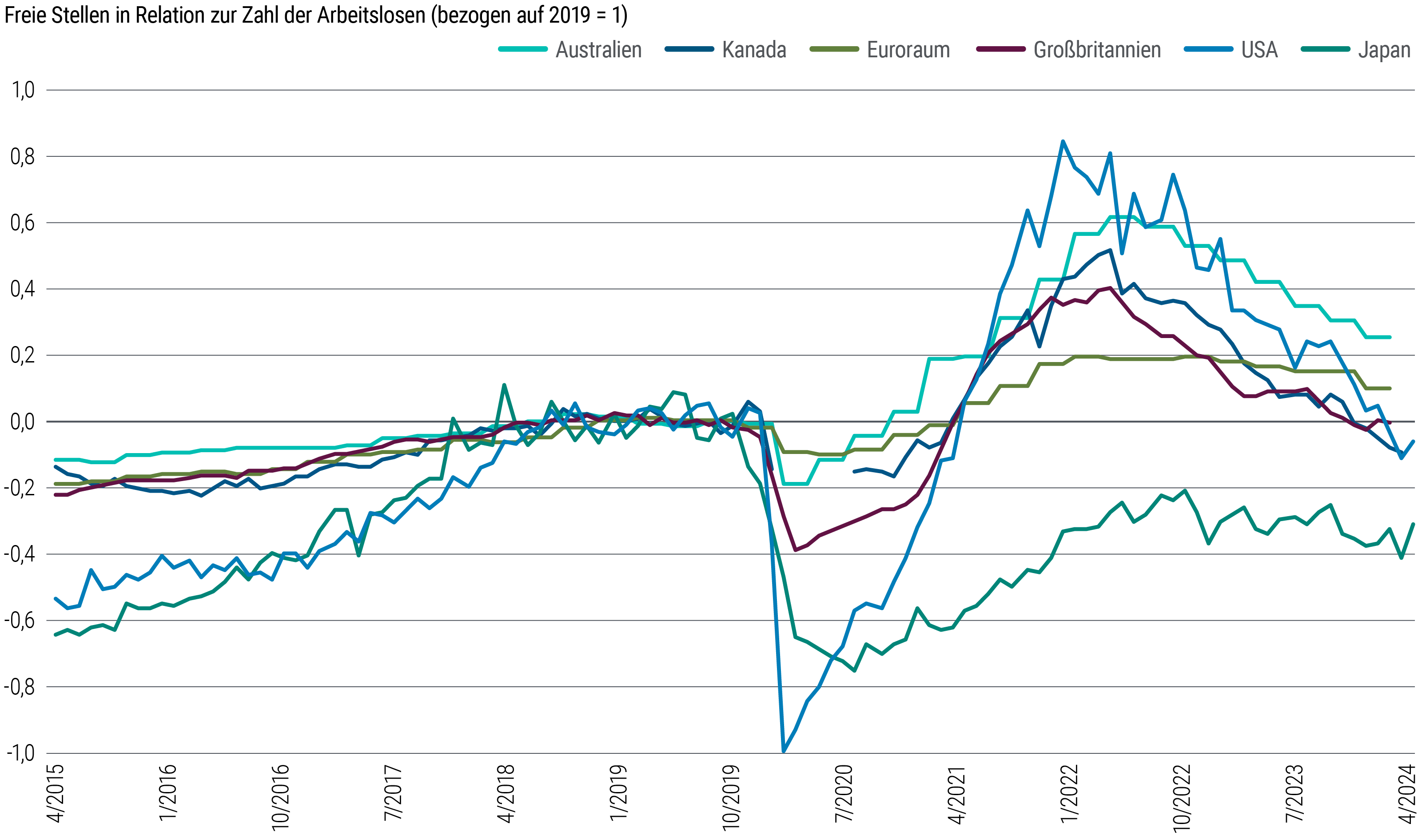 Das robustere Wachstum und die hartnäckigere Inflation in den USA verzögerten den Beginn des Zinssenkungszyklus der US-Notenbank. Er begann später als in anderen Industriestaaten. Zukunftsgerichtete Inflationsindikatoren deuten jedoch darauf hin, dass im Jahr 2025 weitere Fortschritte in Richtung des Inflationsziels der Fed von zwei Prozent wahrscheinlich sind. Zu den Faktoren, die diesen Ausblick stützen, gehören eine Inflation der Lohnstückkosten von fast zwei Prozent, ein Verhältnis von offenen Stellen zu Arbeitslosen, das unter dem Niveau von 2019 liegt (siehe Abbildung 2), und eine steigende Arbeitslosenquote, die die „Komfortzone“ der Fed von rund vier Prozent zu überschreiten droht.