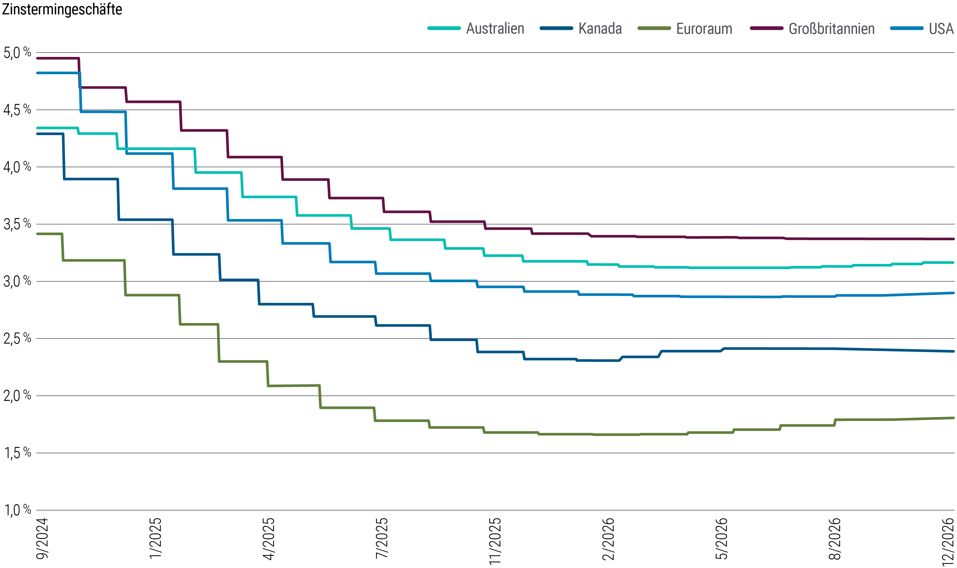 Angesichts der längerfristigen Trends in Bezug auf die Demografie und das Vermögensgefälle sowie des unsicheren Tempos und Ausmaßes der Investmentzyklen haben wir jedoch an unserer Schätzung von null bis ein Prozent für den langfristigen neutralen Realzins festgehalten, wie wir in unserem jüngsten langfristigen Ausblick mit dem Titel „Renditevorteil“ dargelegt haben.Dies deutet auf einen neutralen nominalen Leitzins im Bereich von zwei bis drei Prozent hin. Als wir den Langfristausblick im Juni veröffentlicht hatten, stellten wir fest, dass die damaligen Marktpreise darauf hindeuteten, dass es unwahrscheinlich sei, dass der neutrale Leitzins unter vier Prozent fallen würde. Seitdem haben sich die Marktpreise wieder eher unseren Erwartungen angepasst.