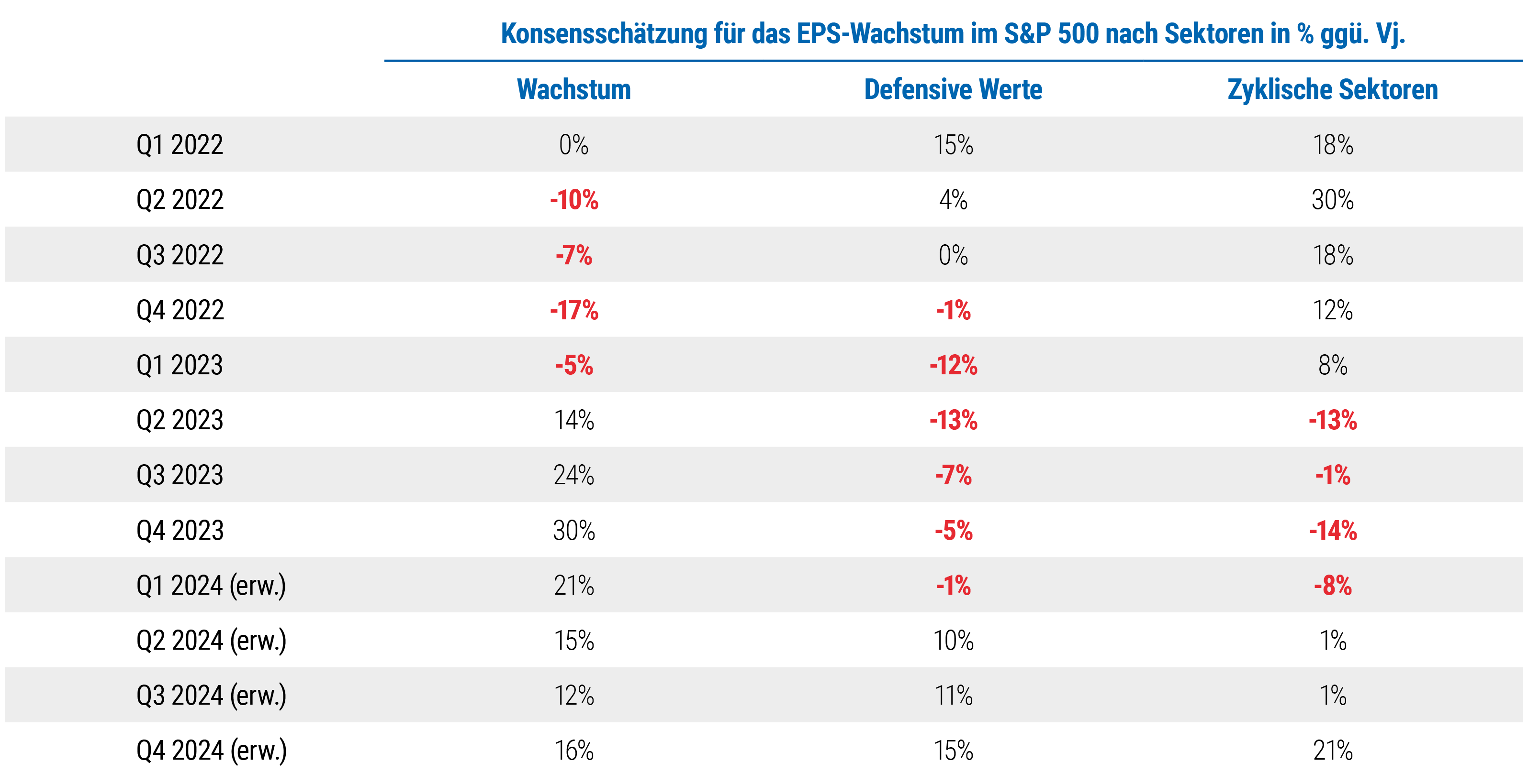 Tatsächlich durchliefen die Wachstumswerte im US-Aktienindex S&P 500 (der von Tech-Firmen dominiert wird) im Verlauf von 2022 eine solche EPS-Rezession, bevor sie sich im Jahr 2023 wieder erholten, als der Gewinn je Aktie in den meisten anderen Sektoren zurückging (siehe Abbildung 2). Für 2024 erwarten wir, dass defensive und zyklische Werte die Zeit der Gewinneinbußen früher oder später hinter sich lassen, worauf möglicherweise deutliche Kurssteigerungen folgen.