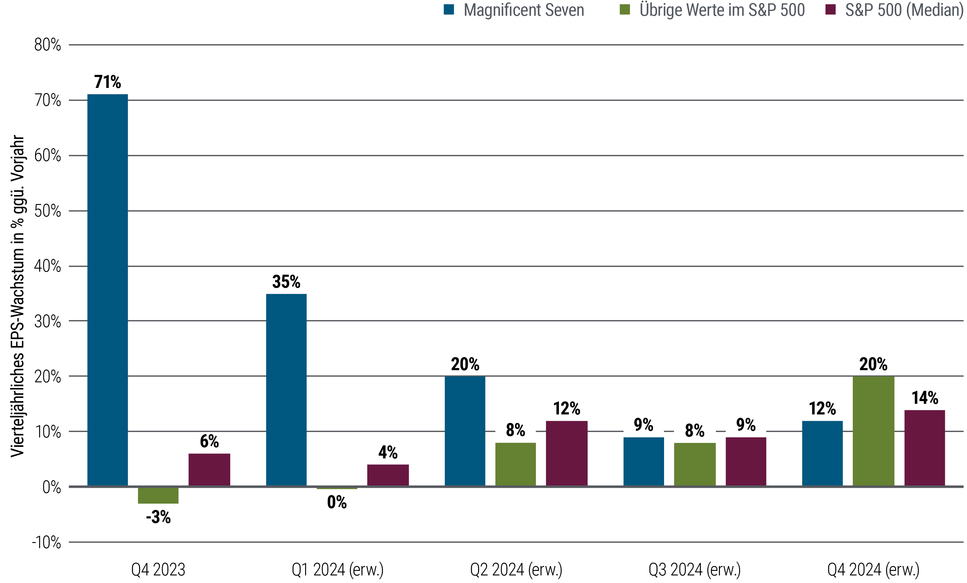 Im Verlauf dieser rollenden Rezessionen und Erholungen könnten sich die EPS-Wachstumsraten der Spitzenreiter und der Nachzügler im S&P 500 wieder annähern. Denn während die „Magnificient Seven“-Technologiewerte im vierten Quartal 2023 ein EPS-Wachstum von 71 Prozent gegenüber dem Vorjahreszeitraum erfuhren, ist bis zum vierten Quartal 2024 mit einer Abschwächung auf zwölf Prozent zu rechnen (siehe Abbildung 3). Für die übrigen 493 Aktien wird im gleichen Zeitraum dagegen ein zunehmendes EPS-Wachstum prognostiziert – von minus drei Prozent auf plus 20 Prozent.