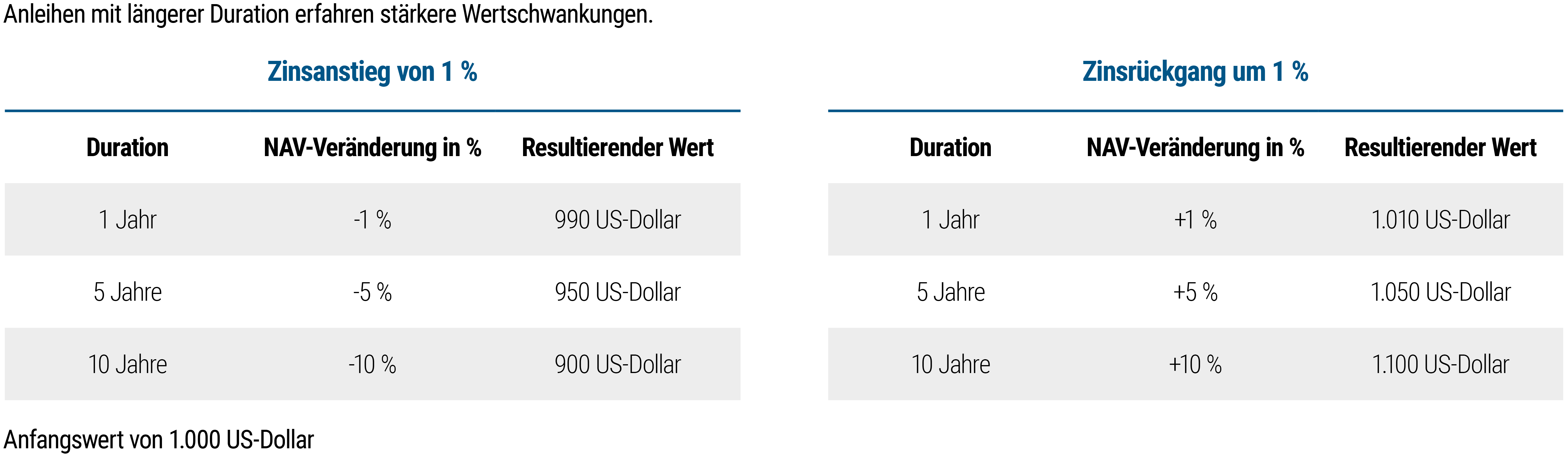 Wie die nachstehende Tabelle zeigt, ist die Volatilität einer Anleihe in der Regel umso geringer, je kürzer ihre Duration ist. Eine Anleihe mit einer Duration von einem Jahr würde beispielsweise lediglich 1% an Wert verlieren, sollten die Zinsen um 1% steigen. Eine Anleihe mit einer Duration von zehn Jahren würde indes 10% an Wert verlieren, falls die Zinsen um 1% steigen. Dagegen würden Anleihen mit einer längeren Duration bei einem Zinsrückgang von 1% stärker hinzugewinnen als solche mit einer kürzeren Duration, deren Wert also weniger deutlich steigen würde.