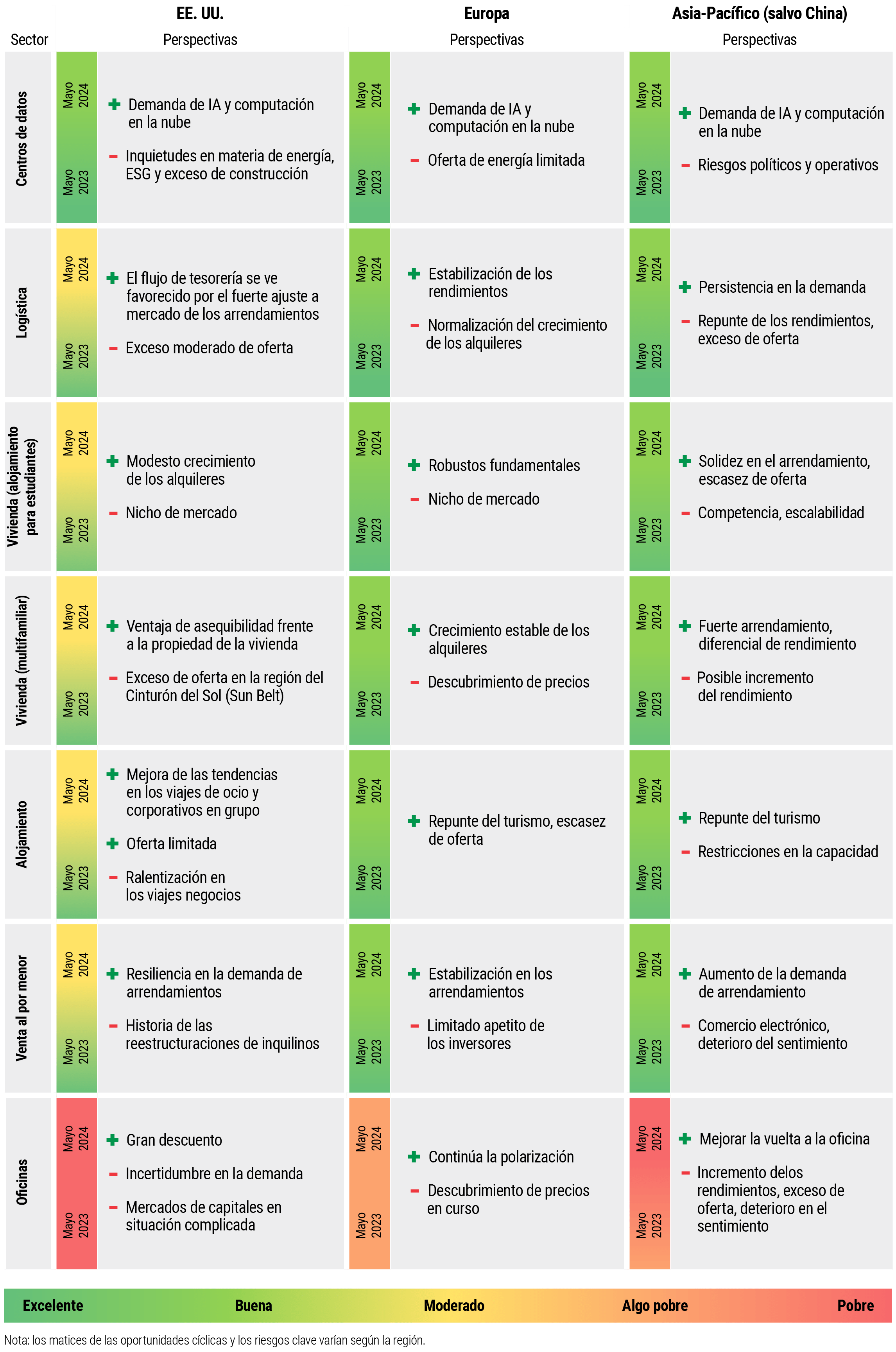 También existe un riesgo geopolítico. Los conflictos en Ucrania y Oriente Próximo, las tensiones entre Estados Unidos y China, y los importantes comicios de este año dan lugar a una incertidumbre adicional. Esto se ve agravado por la creciente preocupación por el cambio climático, que incide de forma directa en la inversión y la promoción inmobiliaria.