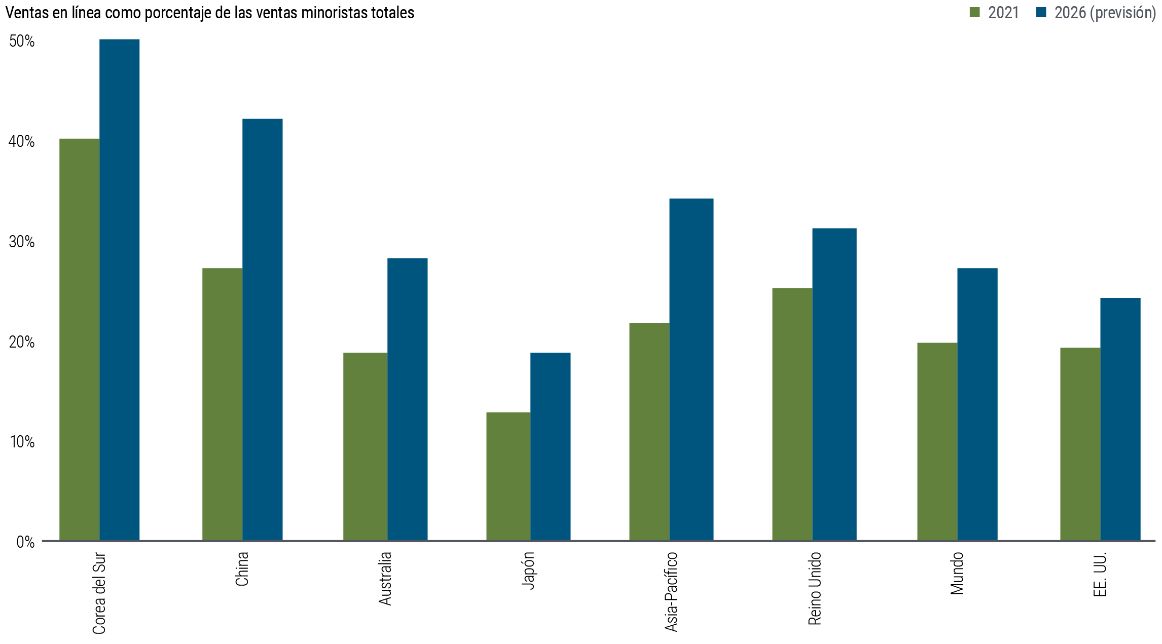 En la región de Asia-Pacífico, se prevé que las ventas online crezcan en torno al 20% de las ventas totales en 2021 a casi el 40% en 2026.Footnote4 Además, la desglobalización sigue impulsando las tendencias de la deslocalización «nearshoring» y «friendshoring». Vietnam y la India saldrán ganando a medida que las empresas trasladen la producción de China, mientras que la relocalización podría beneficiar a Japón y Corea del Sur.
