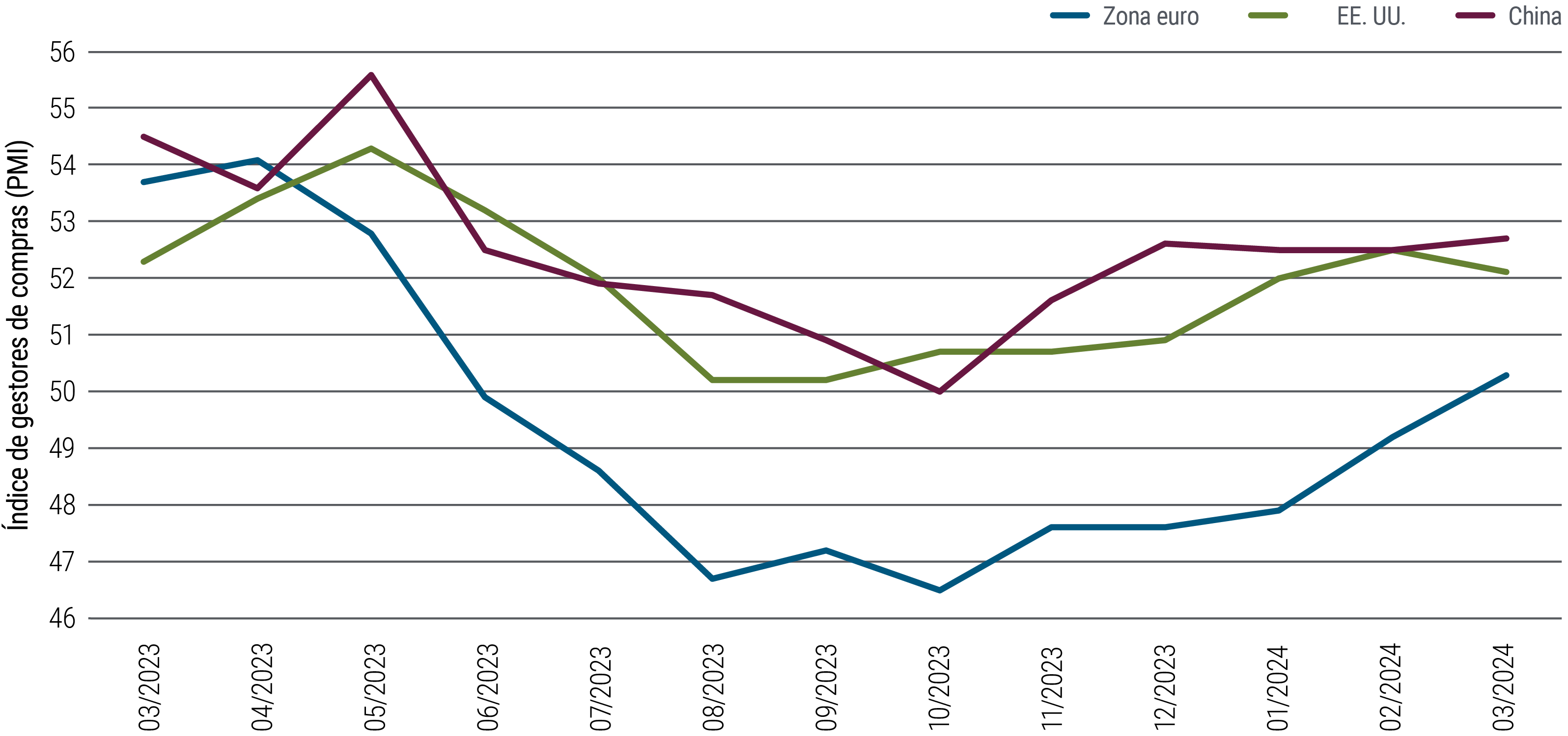 Además de la fortaleza económica de EE. UU., empezamos a ver señales de una incipiente aceleración en el resto del mundo, tras un 2023 en el que los mercados desarrollados (ex EE. UU.) registraron un crecimiento entre plano y ligeramente negativo. Por ejemplo, los índices de gestores de compra (PMI), que son un indicador adelantado de actividad, han rebotado en algunas regiones en los dos últimos meses (ver gráfico 1). Aun así, es previsible que EE. UU. siga siendo el principal motor del crecimiento mundial, sobre todo en comparación con otros mercados desarrollados.