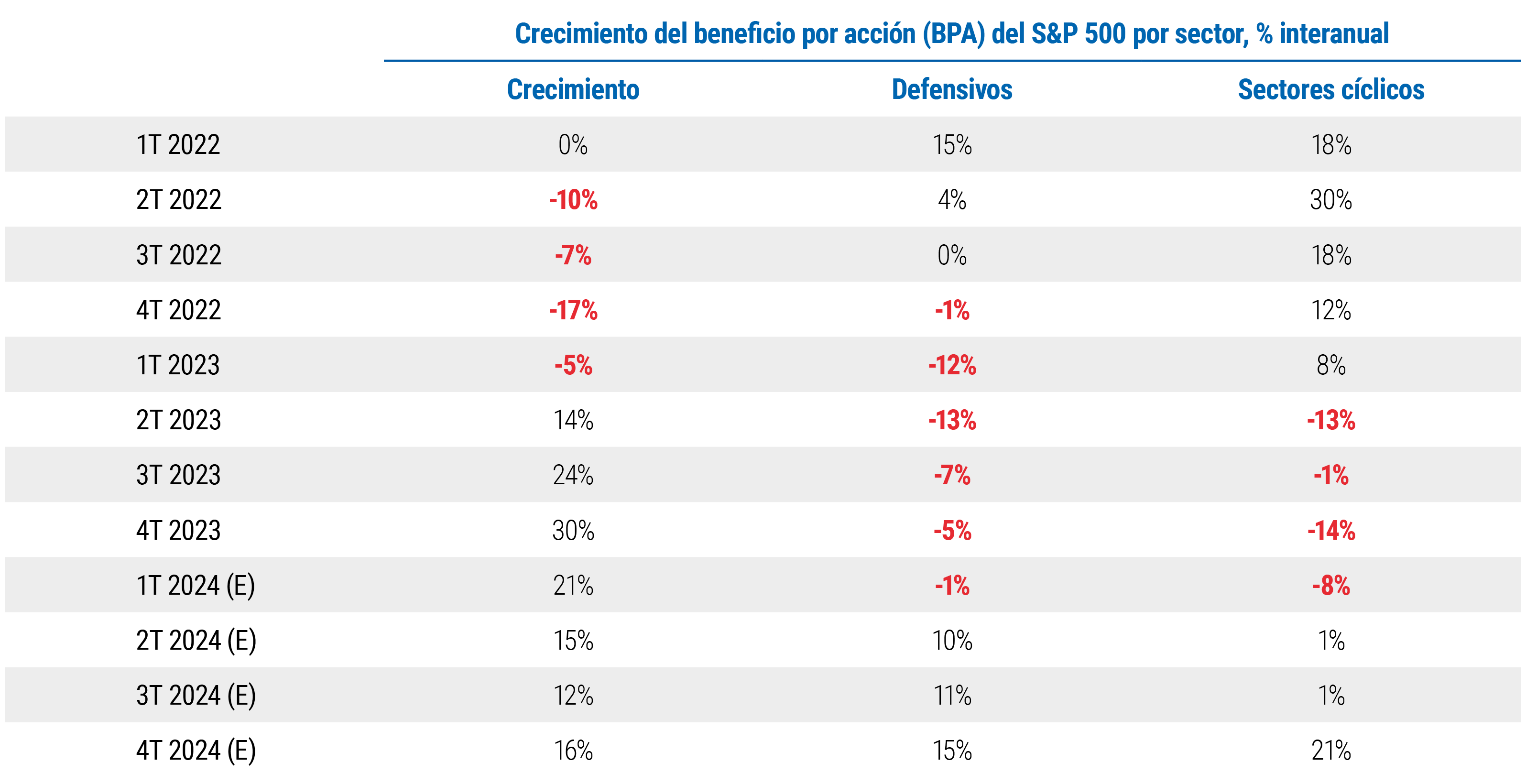 De hecho, el sector growth del S&P 500 (dominado por la tecnología) sufrió una recesión del BPA en 2022 y se recuperó en 2023, justo cuando los BPA de la mayoría de los otros sectores se estaban contrayendo (ver gráfico 2). A medida que avance 2024, prevemos que los valores defensivos y cíclicos dejarán atrás las caídas de beneficios, lo que podría implicar subidas de precios significativas.