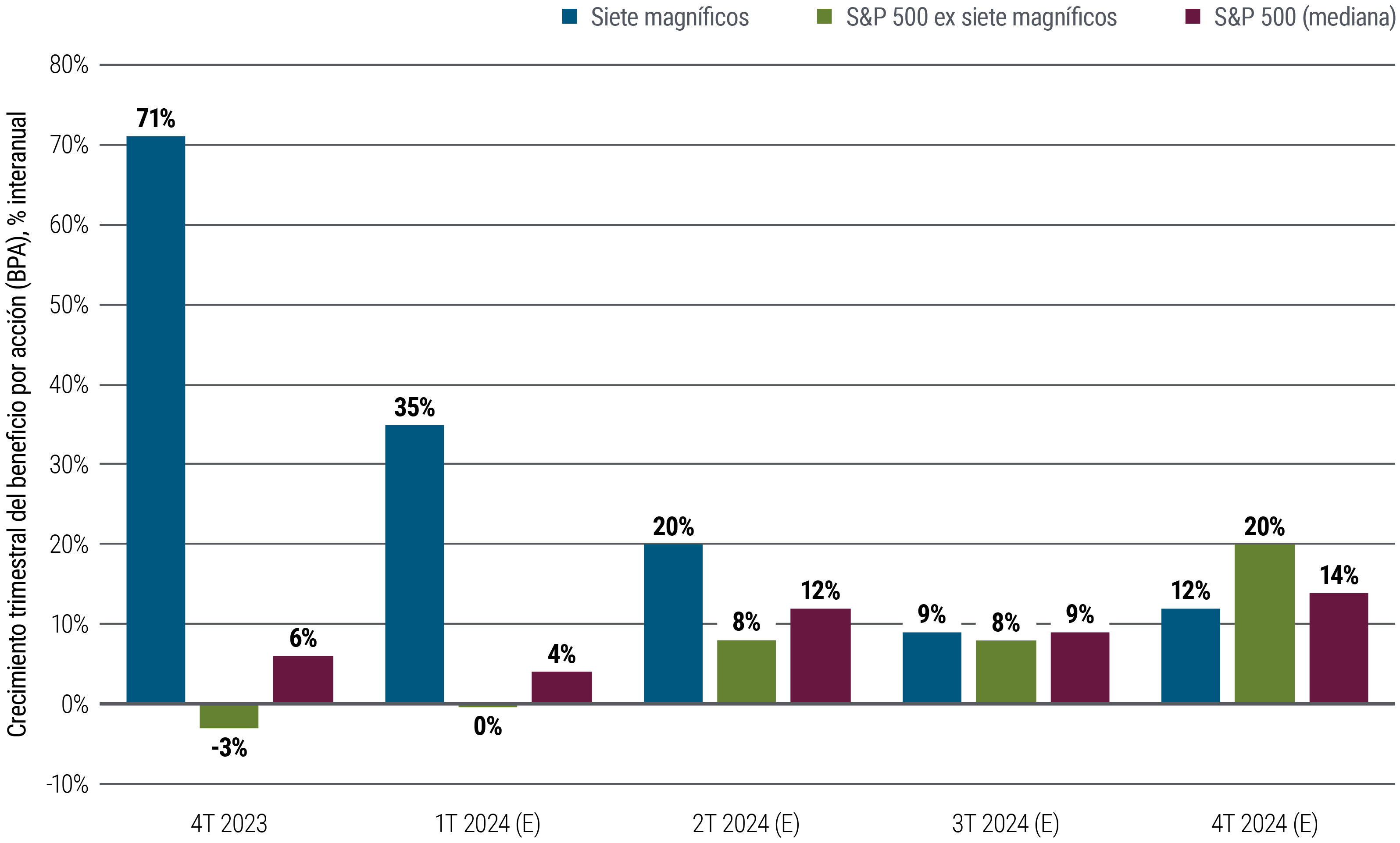El crecimiento de beneficios podría impulsar las rentabilidades de precios de este segundo grupo y prevemos que las ganancias se repartan de forma más generalizada, en vez de concentrarse en los siete magníficos (que generaron cinco puntos porcentuales del 11% de rentabilidad total que se anotó el S&P 500 en el primer trimestre de 2024). Energía y salud se encuentran entre los sectores cuyos beneficios probablemente se acelerarán más este año. Por el contrario, las grandes tecnológicas y los servicios de comunicaciones podrían experimentar una desaceleración del crecimiento de sus BPA (que, no obstante, seguirá siendo alto).