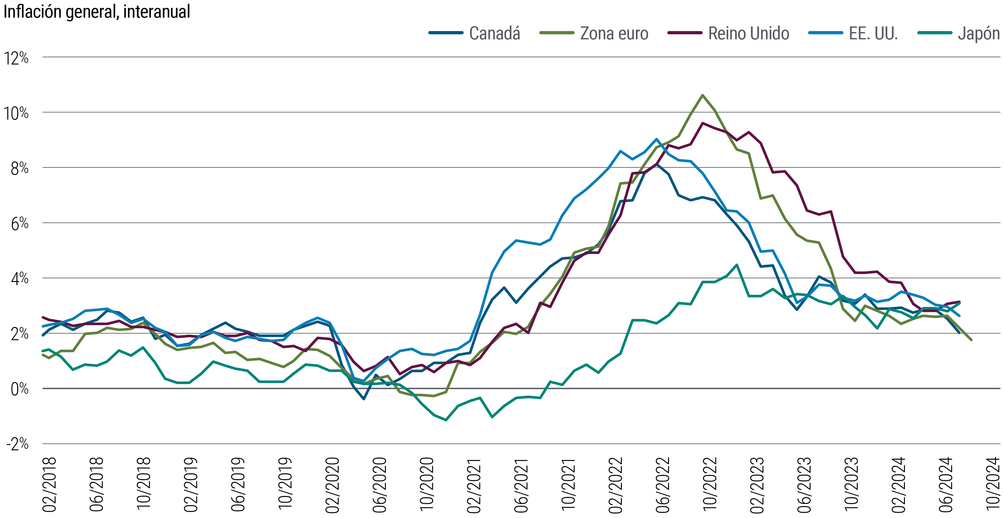 En el resto de los mercados desarrollados, la menor demanda, la relajación de los mercados laborales y el anclaje de las expectativas de inflación también sugieren que la inflación rozará los niveles objetivo en 2025. Canadá destaca como la economía desarrollada en la que, con mayor probabilidad, la inflación no alcanzará el objetivo, mientras que, en Australia, los indicadores del mercado de trabajo apuntan a que los avances serán algo más lentos.