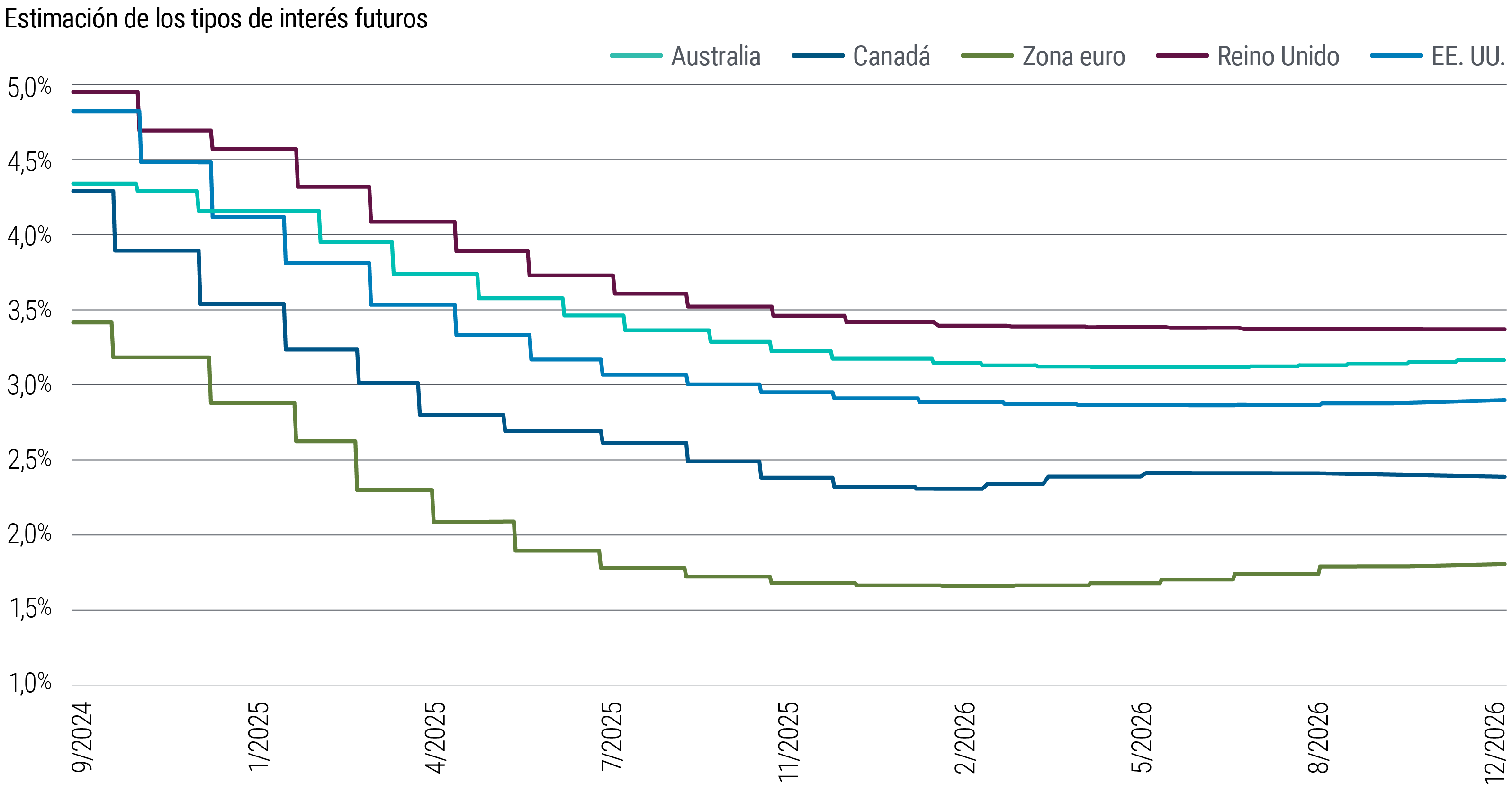 En vista de la dispersión de las perspectivas económicas y las trayectorias de política monetaria de los bancos centrales, preferimos las posiciones en duración de Reino Unido y Australia, donde el mercado descuenta unos tipos terminales algo más altos que en EE. UU., la eurozona y otros mercados mundiales (ver gráfico 3).