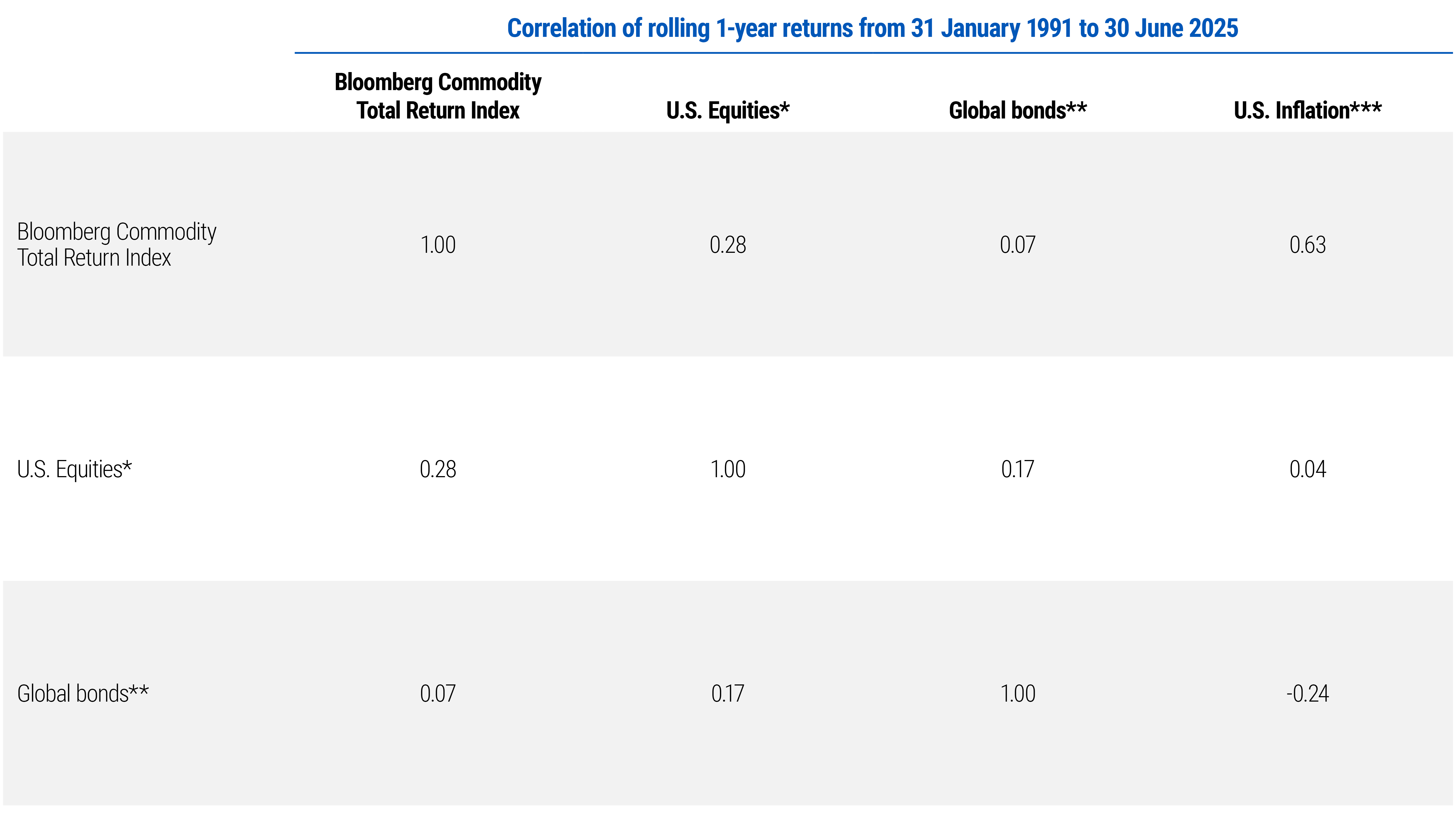 Between 1991 and 2025, rolling 1-year returns on the Bloomberg Commodity Total Return Index had a low correlation with U.S. equities, as represented by the S&P 500 Total Return Index, and a correlation close to zero with global bonds, as represented by the Bloomberg Global Aggregate Total Return Index. However, they had a high correlation with the U.S. Consumer Price Index.