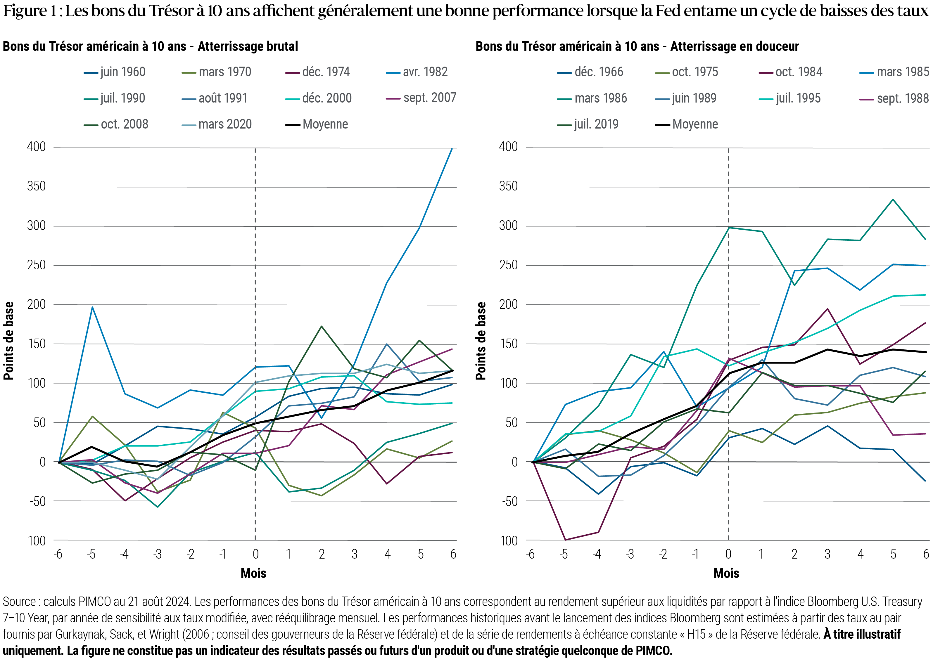 Historiquement, la performance des marchés varie selon que les mouvements de détente monétaire interviennent dans un contexte de grande faiblesse économique (scénario d'atterrissage brutal) ou dans un climat plus apaisé (atterrissage en douceur). Quelques exemples :