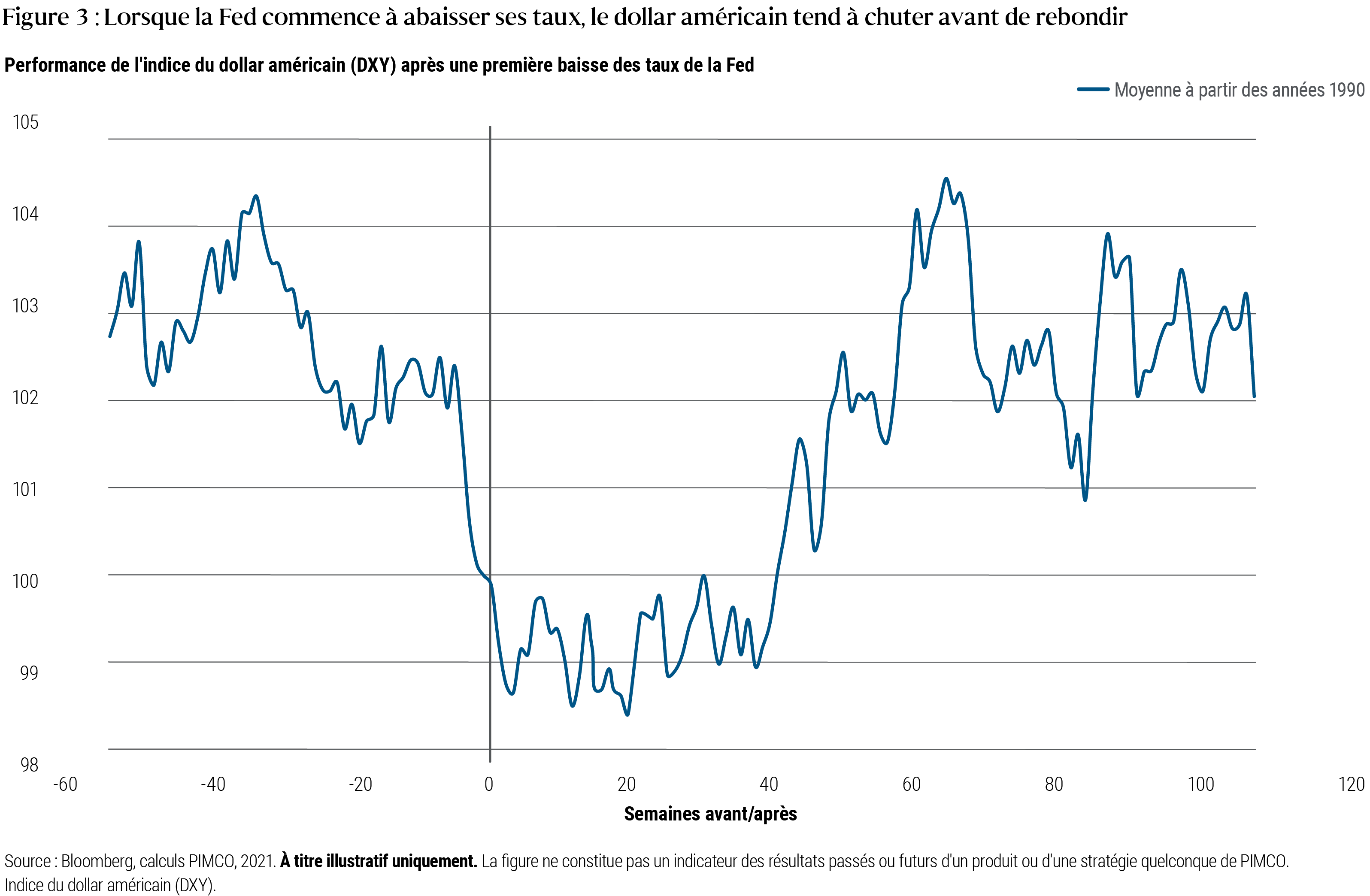 Lors des cycles d'assouplissement passés, en contexte d'atterrissage brutal ou en douceur, le billet vert montrait généralement une tendance à la baisse, puis se redressait dans les mois suivant les premières baisses de taux (voir Figure 3). Le dollar pourrait selon nous perdre son statut de devise à rendement élevé à mesure que la politique monétaire se normalise, et une légère dépréciation n'est pas à exclure.