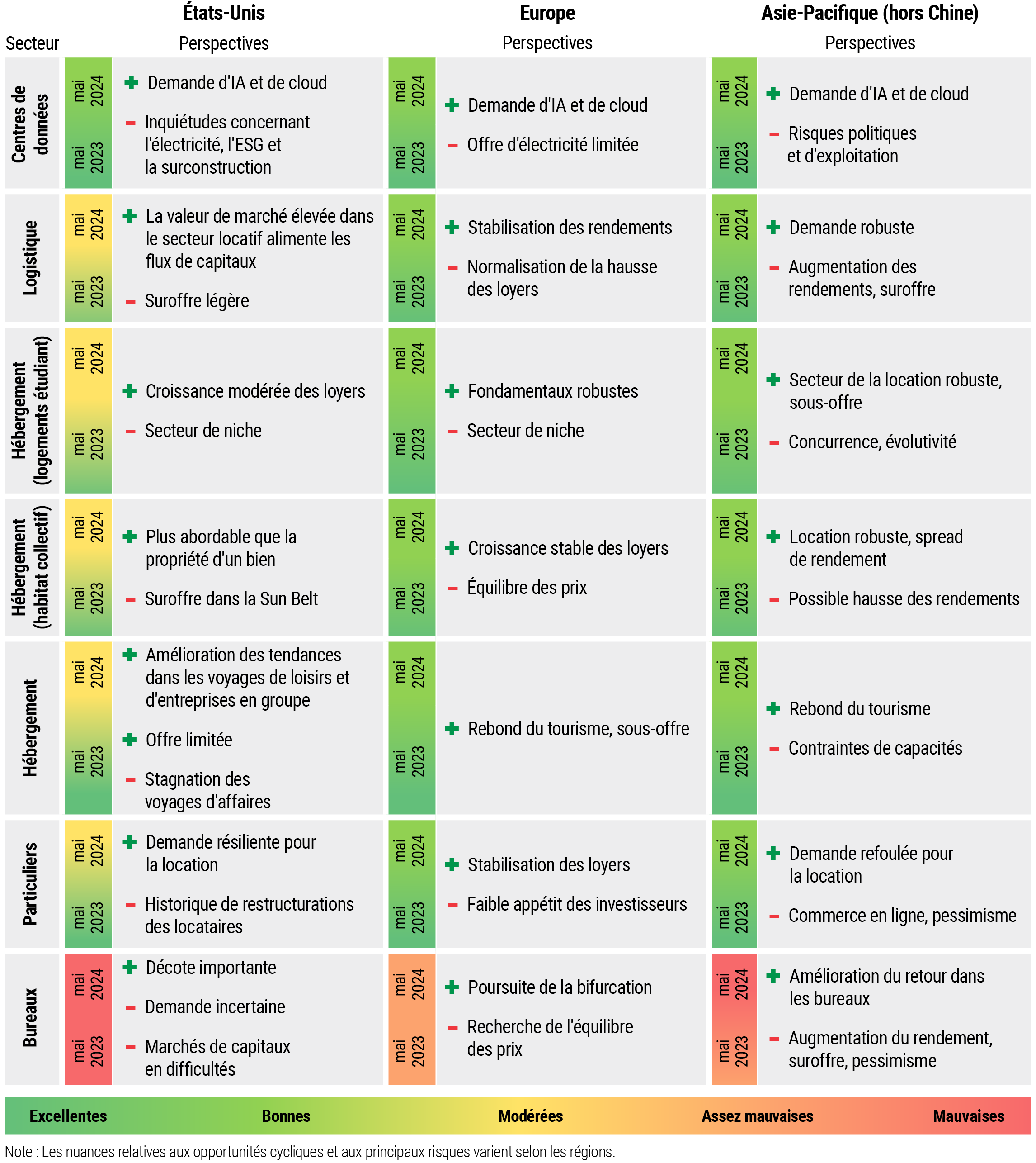 Le risque géopolitique est lui aussi bien présent. Les conflits en Ukraine et au Moyen-Orient, les tensions entre les États-Unis et la Chine et les grands scrutins prévus cette année génèrent des incertitudes supplémentaires. S'ajoutent à cela les craintes croissantes concernant le changement climatique, qui affectent directement l'investissement et le développement immobiliers.