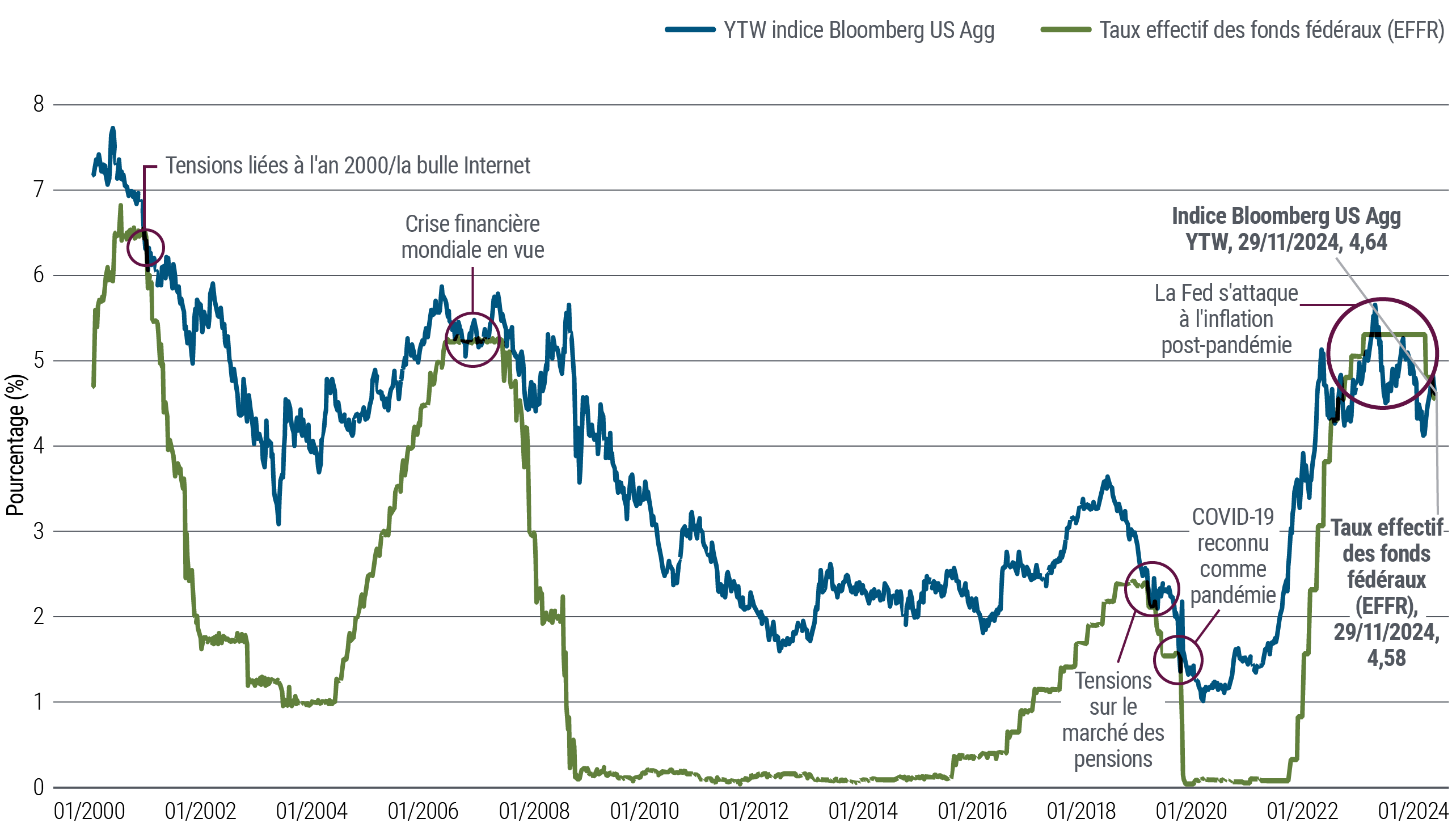 Les signaux de marché et les interventions de la Fed indiquent que les rendements obligataires ont entamé une nouvelle phase. Le niveau élevé des rendements de départ ainsi que les attentes de taux inférieurs dressent des perspectives attrayantes pour un large éventail d'obligations. Les investisseurs qui s'en tiennent aux liquidités seraient peut-être bien avisés d'envisager l'obligataire.