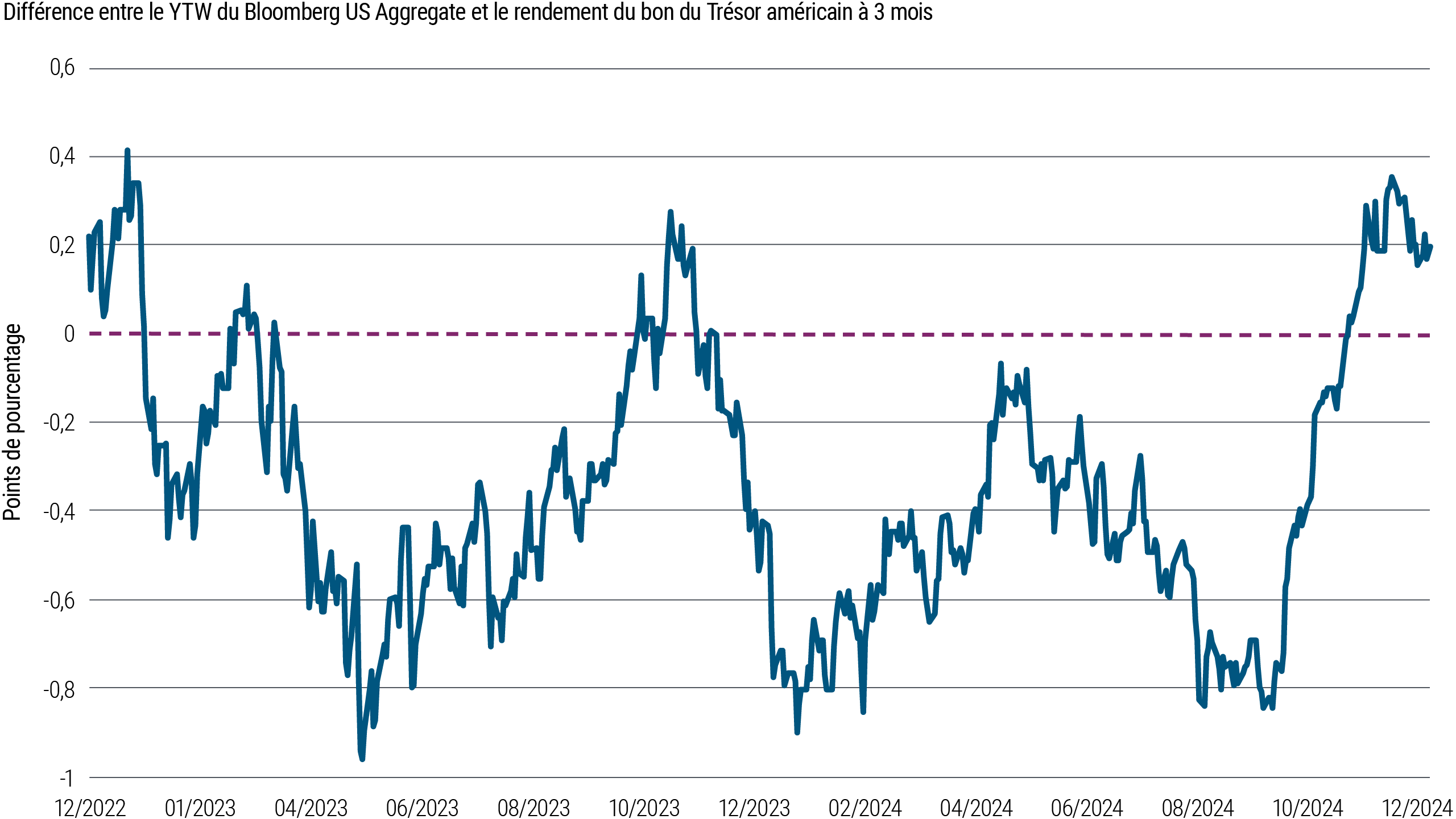 Parallèlement, nous avons observé un accroissement marqué des rendements obligataires après les planchers atteints durant la pandémie. Par rapport aux liquidités, dont les rendements s'amenuisent en raison de la baisse des taux, les obligations recèlent un attrait plus important : en témoigne le rendement de ce même indice obligataire de base comparé à un autre indicateur commun représentatif des liquidités, à savoir le rendement des bons du Trésor américain à 3 mois (voir Figure 2). Les liquidités comme les obligations ont généré des rendements attrayants ces deux dernières années, mais les investisseurs en liquidités, par nature, ne peuvent verrouiller ces rendements durant des périodes plus longues. Depuis le mois de septembre, lorsque la Fed a réduit son taux directeur de 50 points de base (pb), les perspectives pour les rendements des liquidités par rapport à ceux des obligations de base se sont par ailleurs largement détériorées.