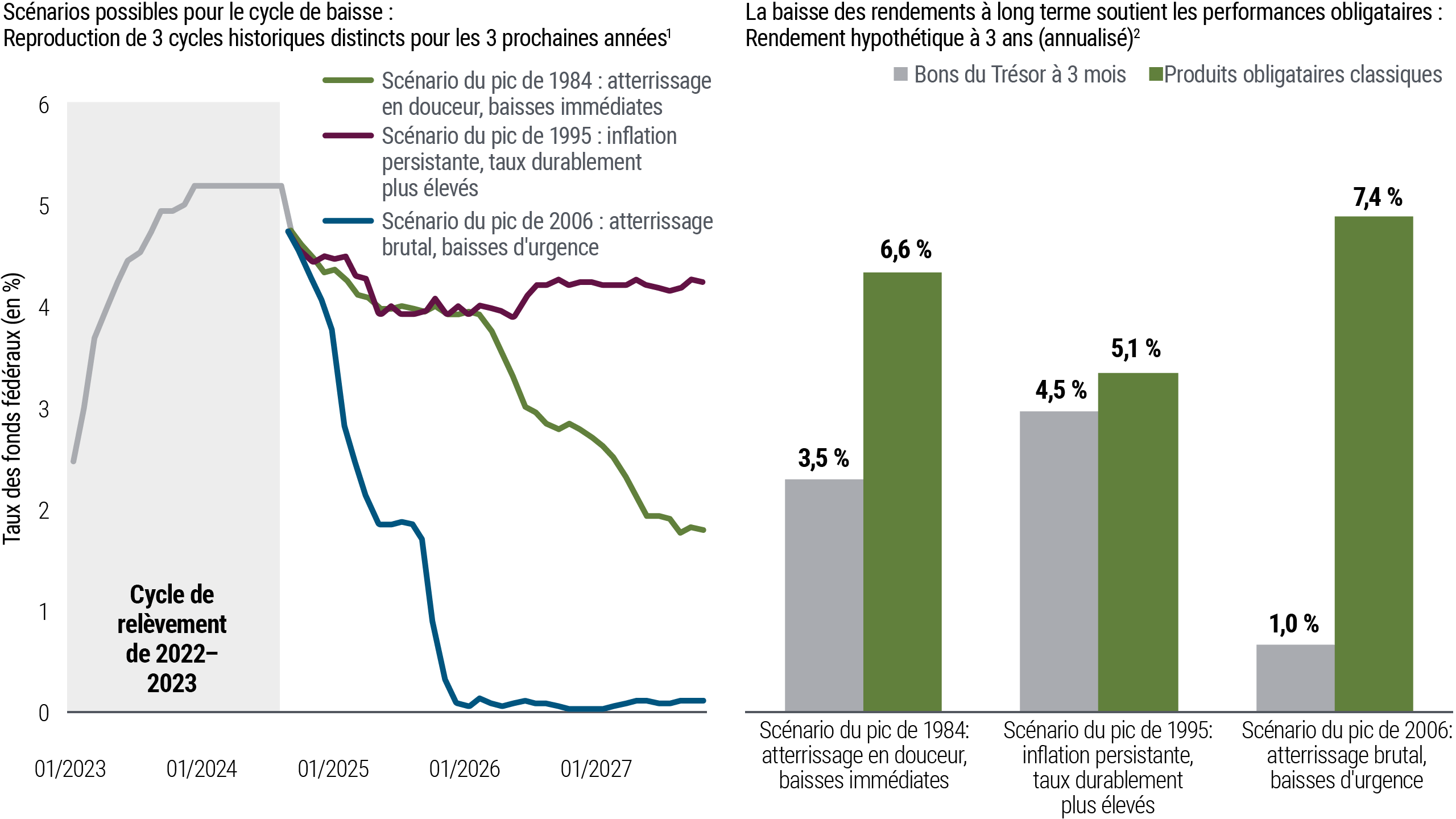 Les obligations sont par ailleurs bien positionnées pour faire face à divers scénarios qui s'écartent de celui de base. Les obligations de haute qualité tendent généralement à bien se comporter durant les phases d'atterrissage en douceur, et mieux encore en période de récession, si c'est le scénario qui prévaut. Les obligations signent d'ordinaire de belles performances également dans divers scénarios de baisse des taux (à l'image des flocons de neige, aucun cycle monétaire ne se ressemble) – voir la Figure 3. Que la Fed ait adopté une approche très progressive (« taux durablement élevés ») ou procédé à une baisse brutale, ou encore qu'elle ait suivi une trajectoire baissière située quelque part entre ces deux extrêmes, les obligations ont fini par générer de meilleurs rendements que les liquidités dans chacun de ces environnements de taux historiques.