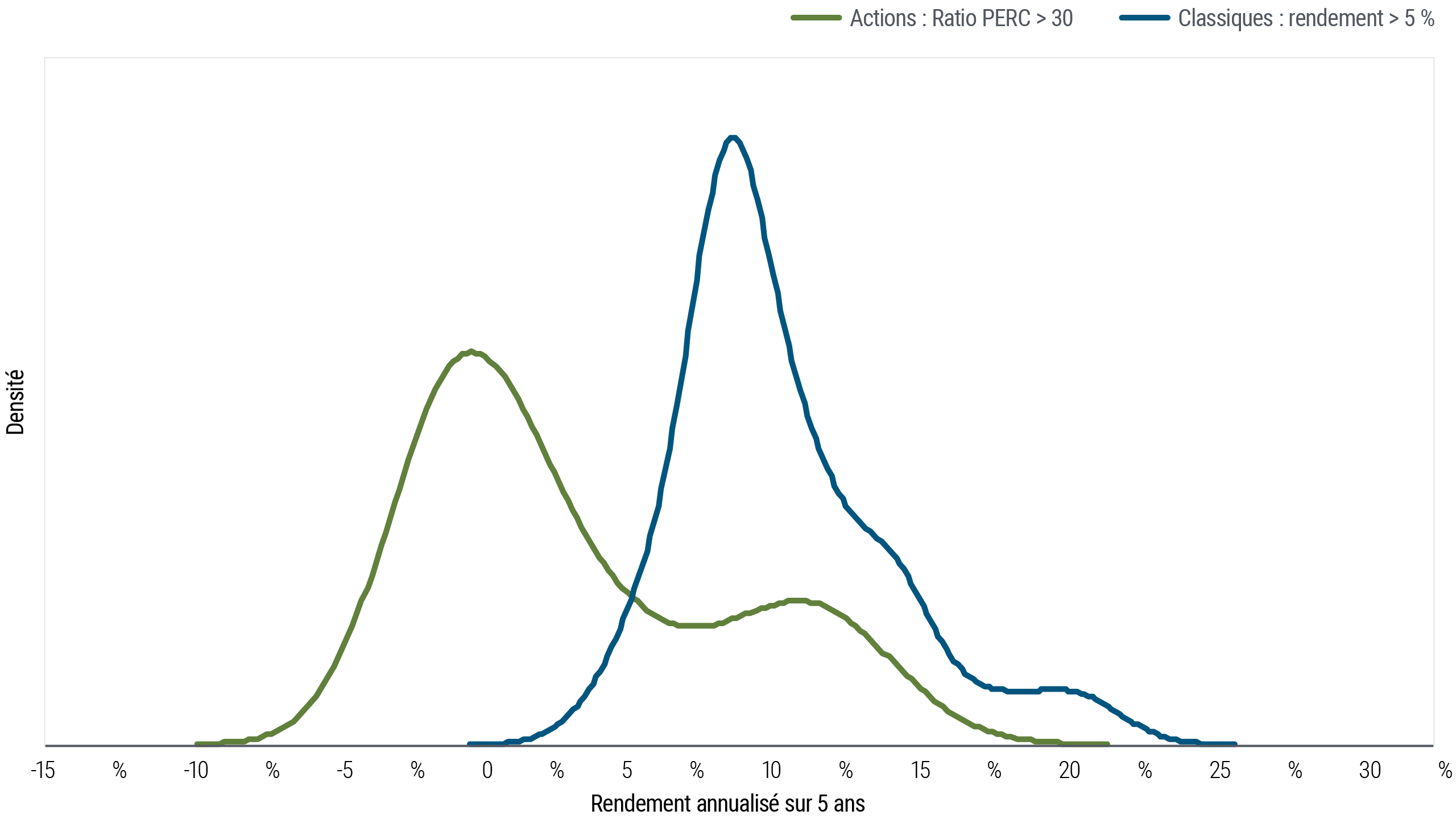 Les tendances historiques confirment également le rôle des obligations en tant que couverture intéressante contre le risque. L'analyse de la moyenne des marchés actions et obligataires depuis 1973, durant les périodes où les obligations américaines de base génèrent des rendements d'environ 5 % ou plus tandis que les ratios bénéficiaires des actions américaines sont supérieurs à 30 (comme c'est le cas aujourd'hui), nous apprend que les obligations ont engrangé des rendements plus élevés à cinq ans (voir Figure 4), avec une volatilité potentiellement plus faible.