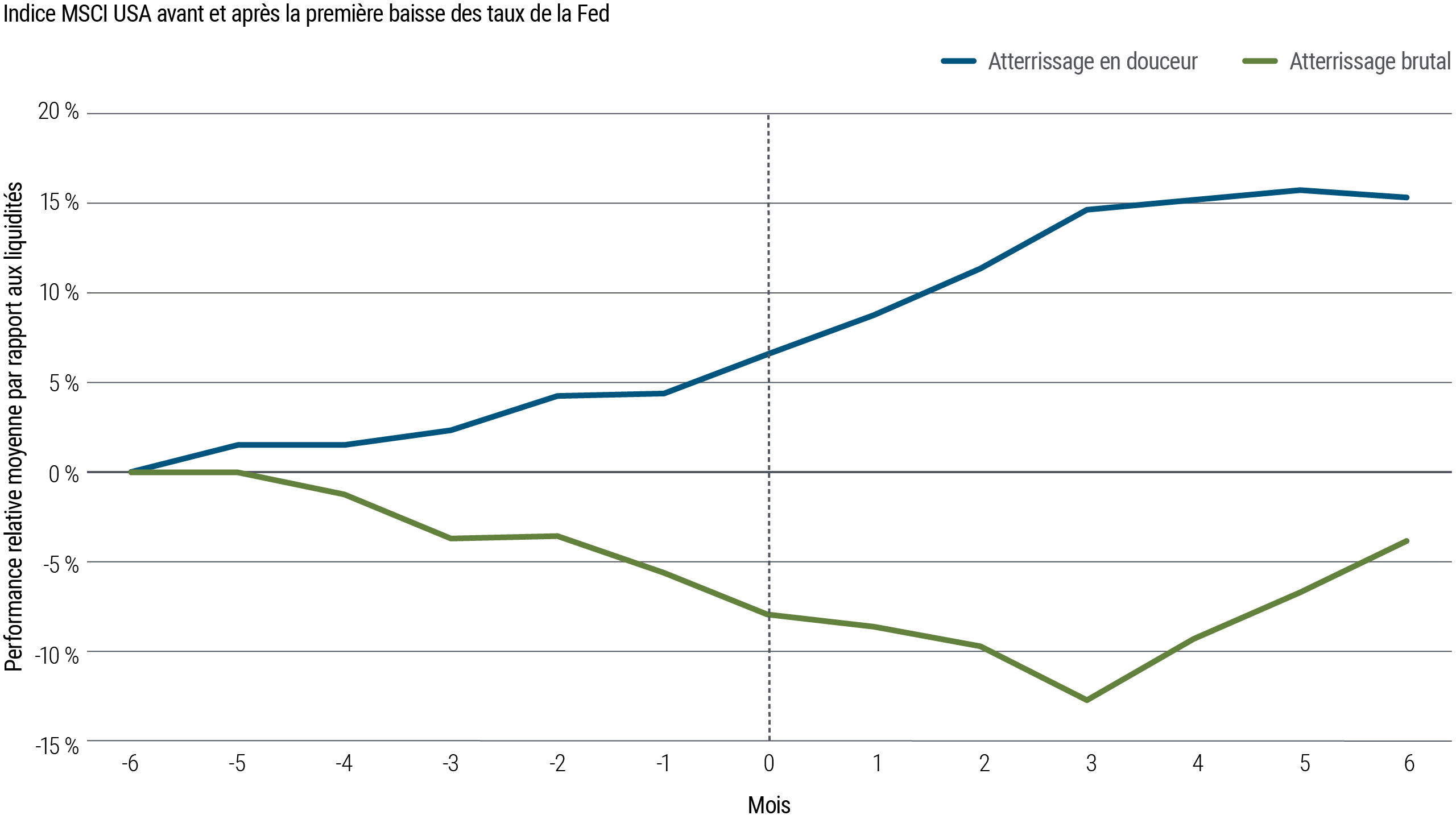 Que le contexte soit celui d'un atterrissage brutal ou d'un atterrissage en douceur, la première baisse de taux d'un cycle stimule généralement la performance des actions, du moins au cours du premier mois, car les baisses de taux tendent à doper le sentiment et l'activité économique réelle. Peu après cela dit, les marchés actions s'alignent habituellement sur l'environnement macroéconomique en vigueur.