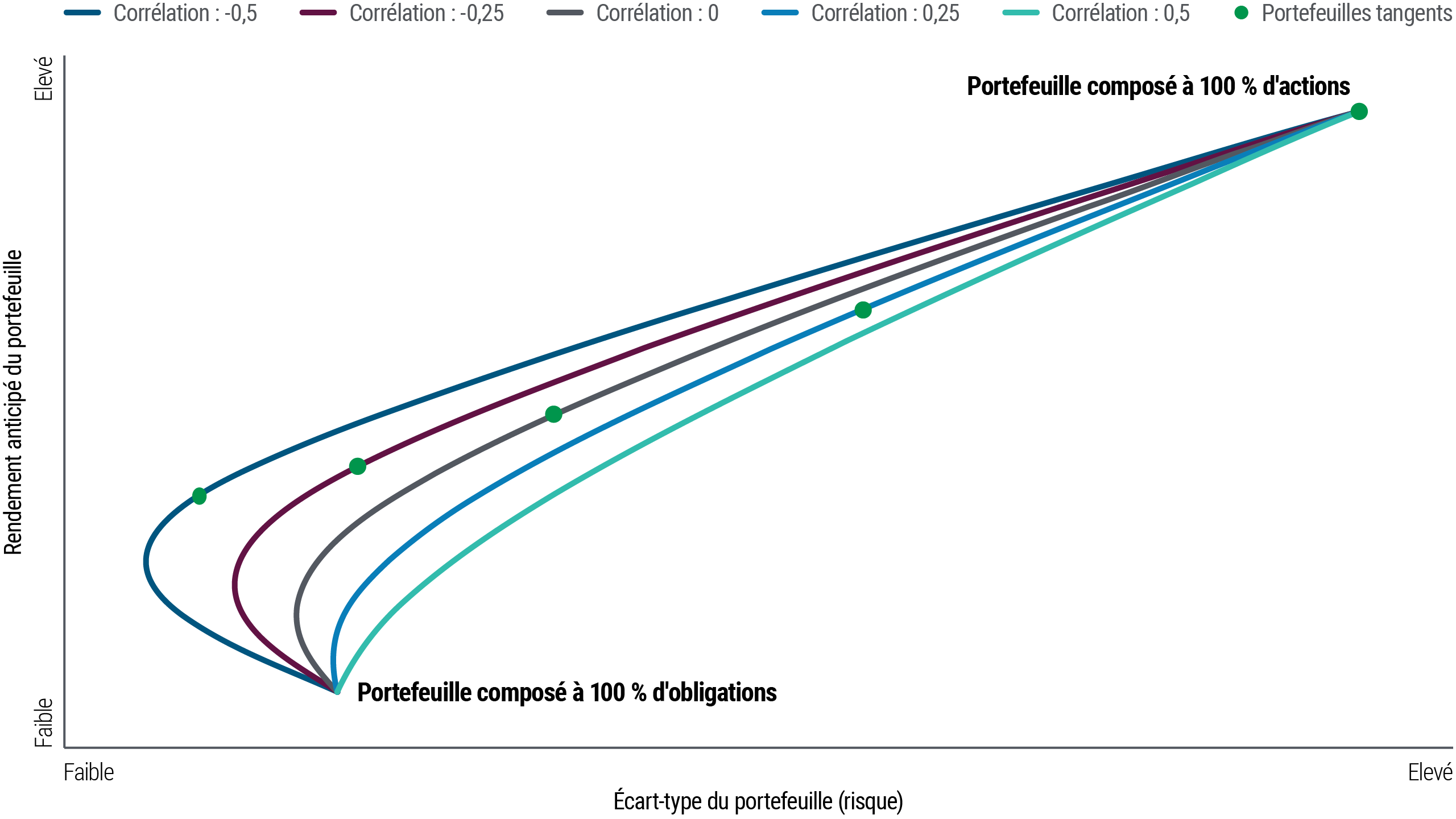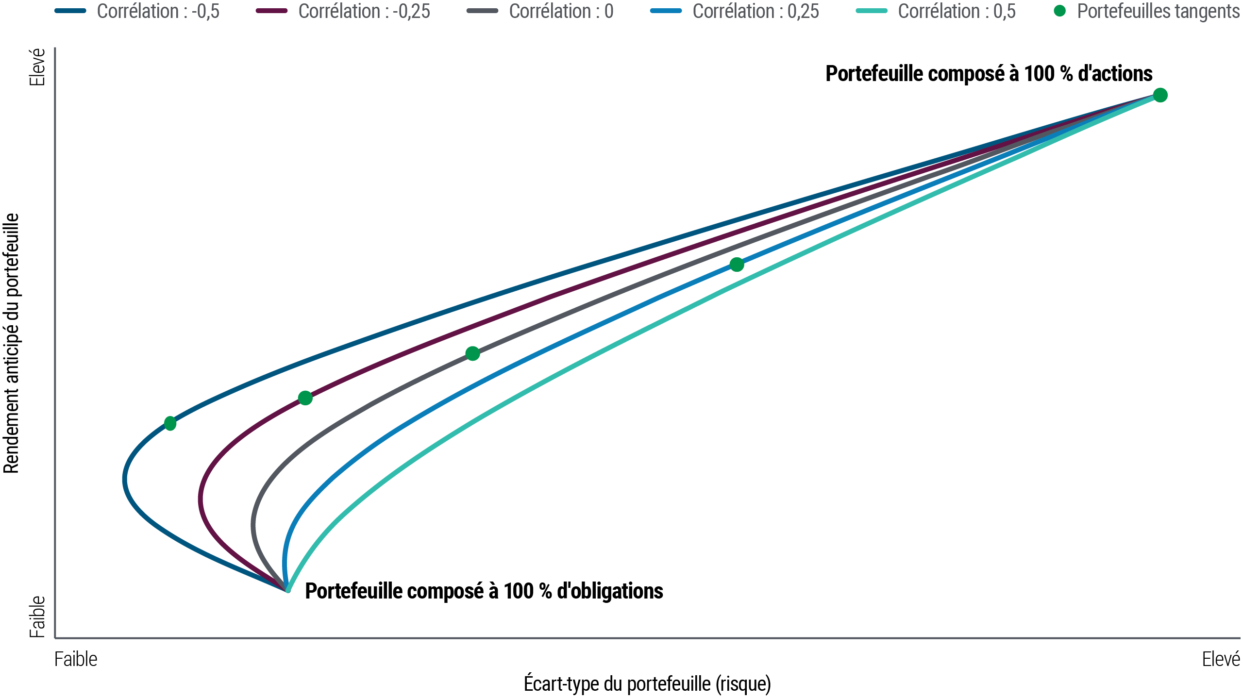 En règle générale, les corrélations négatives permettent de créer un mix d'actifs affichant une volatilité plus faible que n'importe quel actif individuel, tout en visant des rendements attrayants. Le calcul d'une frontière efficiente hypothétique peut nous aider à illustrer ceci (voir Figure 2) : lorsque la corrélation actions-obligations est négative, les portions de la frontière caractérisées par un risque plus faible intègrent certaines configurations dans lesquelles les investisseurs peuvent cibler un mix d'actifs offrant un profil de rendement potentiel légèrement plus élevé malgré une baisse de la volatilité attendue.