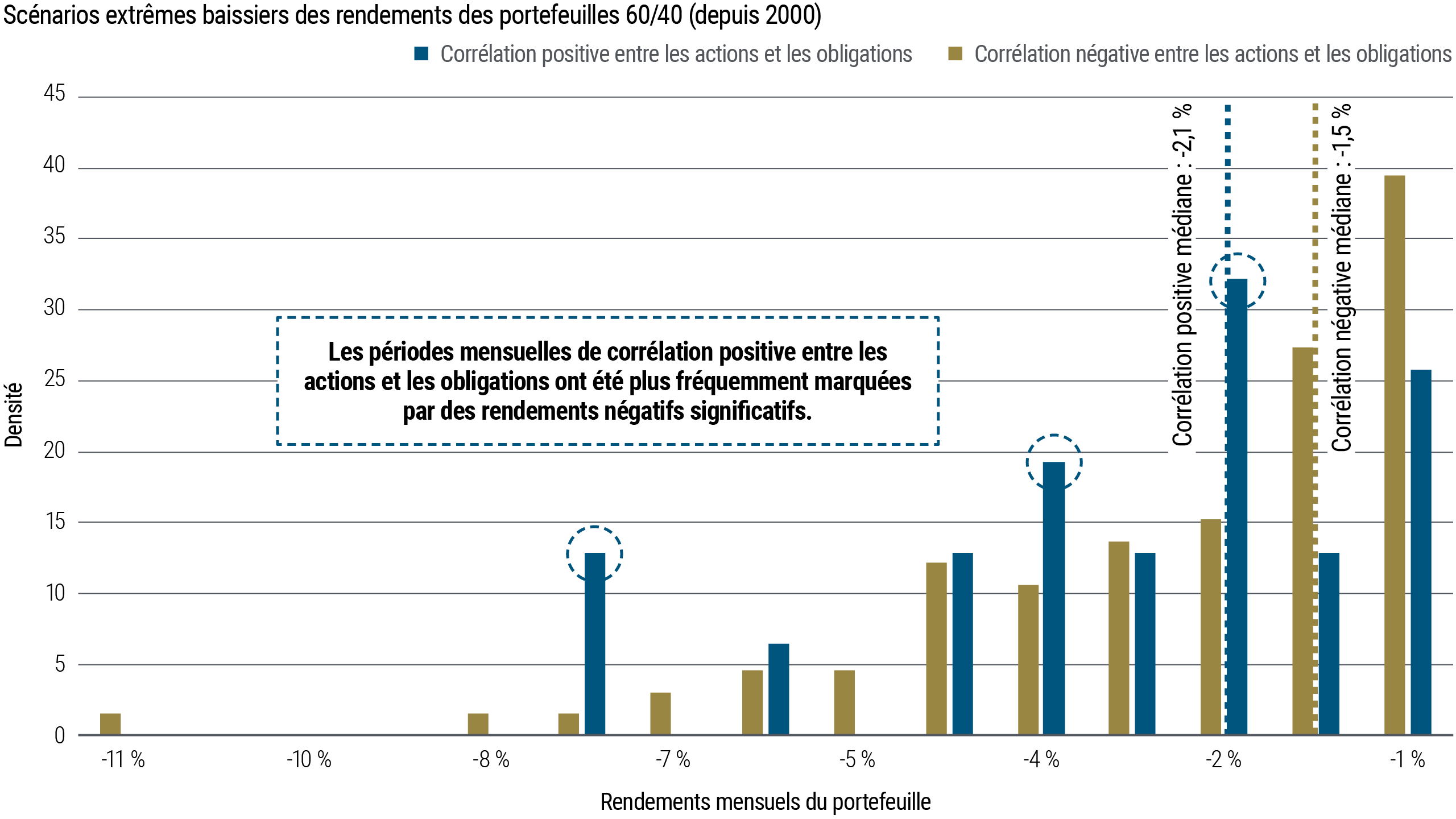 Si l'on examine les scénarios extrêmes historiques de rendements négatifs au sein d'un portefeuille multi-actifs simple composé à 60 % d'actions et à 40 % d'obligations, les avantages d'une corrélation actions-obligations négative apparaissent clairement (voir Figure 3). Les périodes de corrélation positive entre les actions et les obligations débouchent généralement sur des résultats extrêmes négatifs plus marqués pour les portefeuilles multi-actifs que les périodes de corrélation négative. Cela est vrai même si la plupart des récessions s'accompagnent de corrélations actions-obligations largement négatives, dès lors que les corrections des actions se voient partiellement compensées par les gains obtenus grâce à l'allocation obligataire.