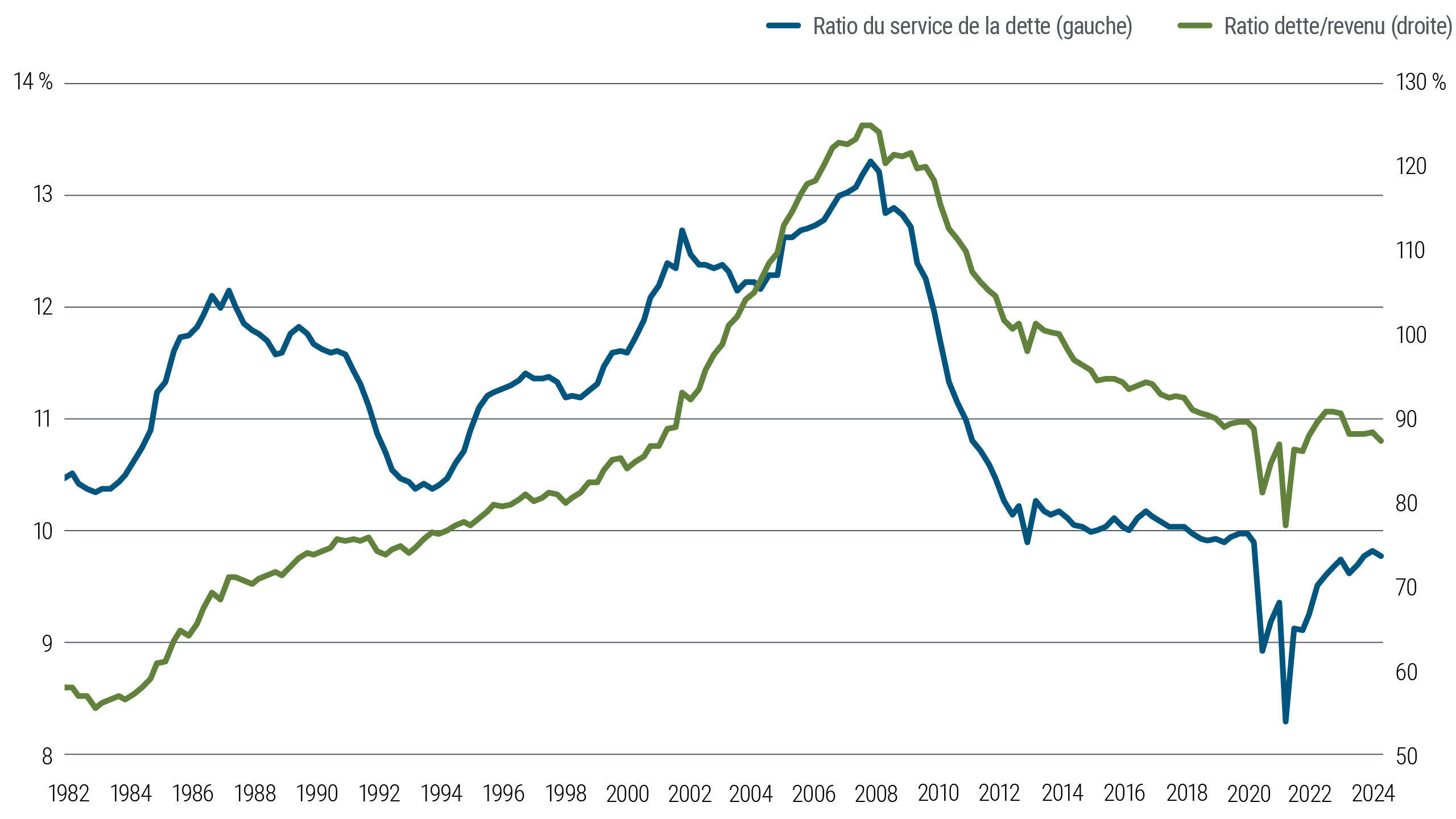 - Prêts à la consommation aux États-Unis : alors que la dette des ménages américains, y compris les prêts personnels, étudiants et les créances sur carte de crédit, atteint plus de 17 billions USD, le secteur américain des prêts à la consommation, hors prêts hypothécaires résidentiels, offre des opportunités considérables. Malgré des taux d'intérêt plus élevés, les bilans des ménages demeurent solides, dès lors que les ratios dette/revenus ont été orientés à la baisse ces dernières années et que le patrimoine net s'approche de plus hauts historiques (voir Figure 2). Les coûts de service de la dette restent faibles en comparaison historique, une situation essentiellement imputable au fait que 95 % des prêts hypothécaires américains sont à taux fixe.