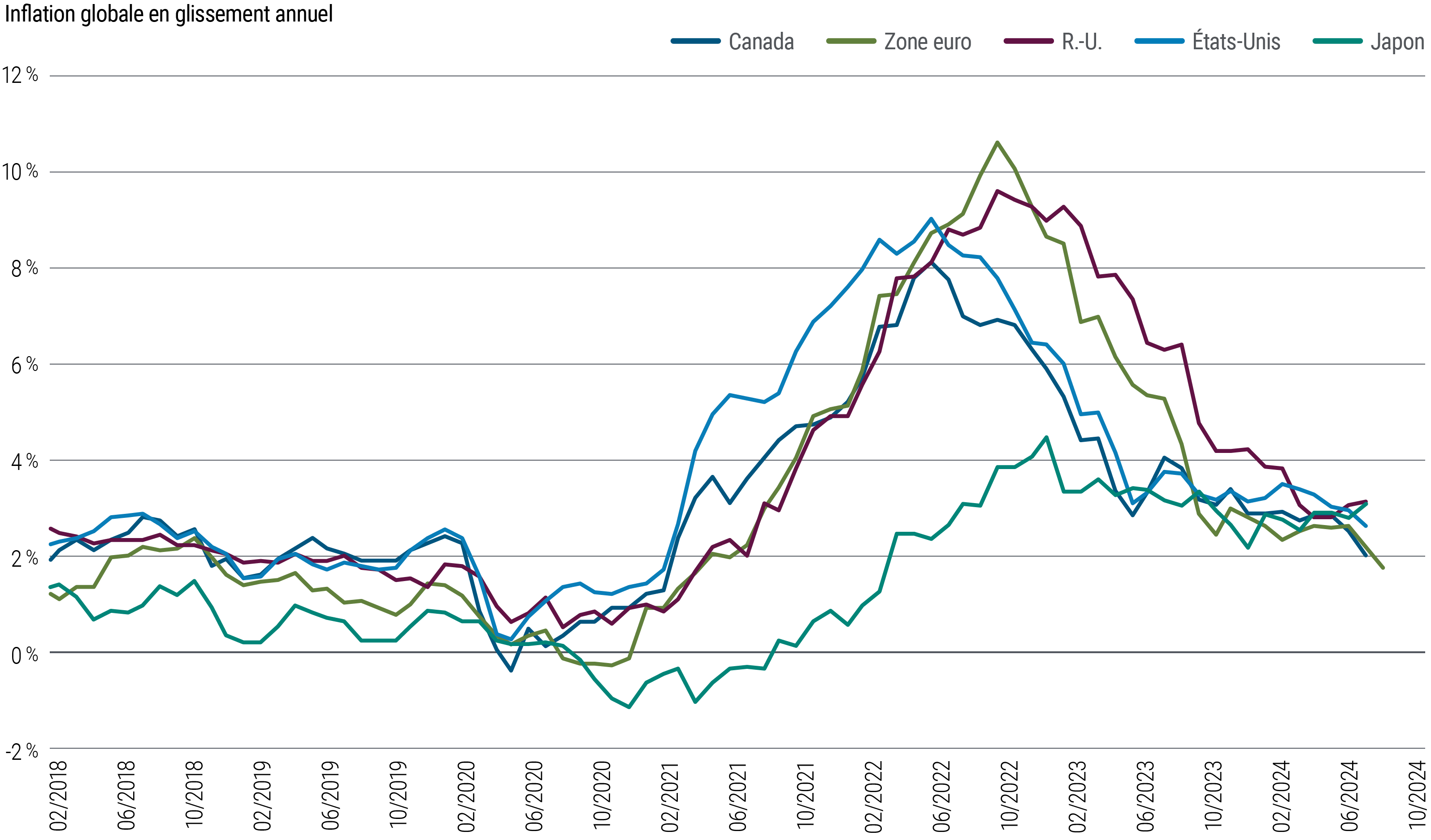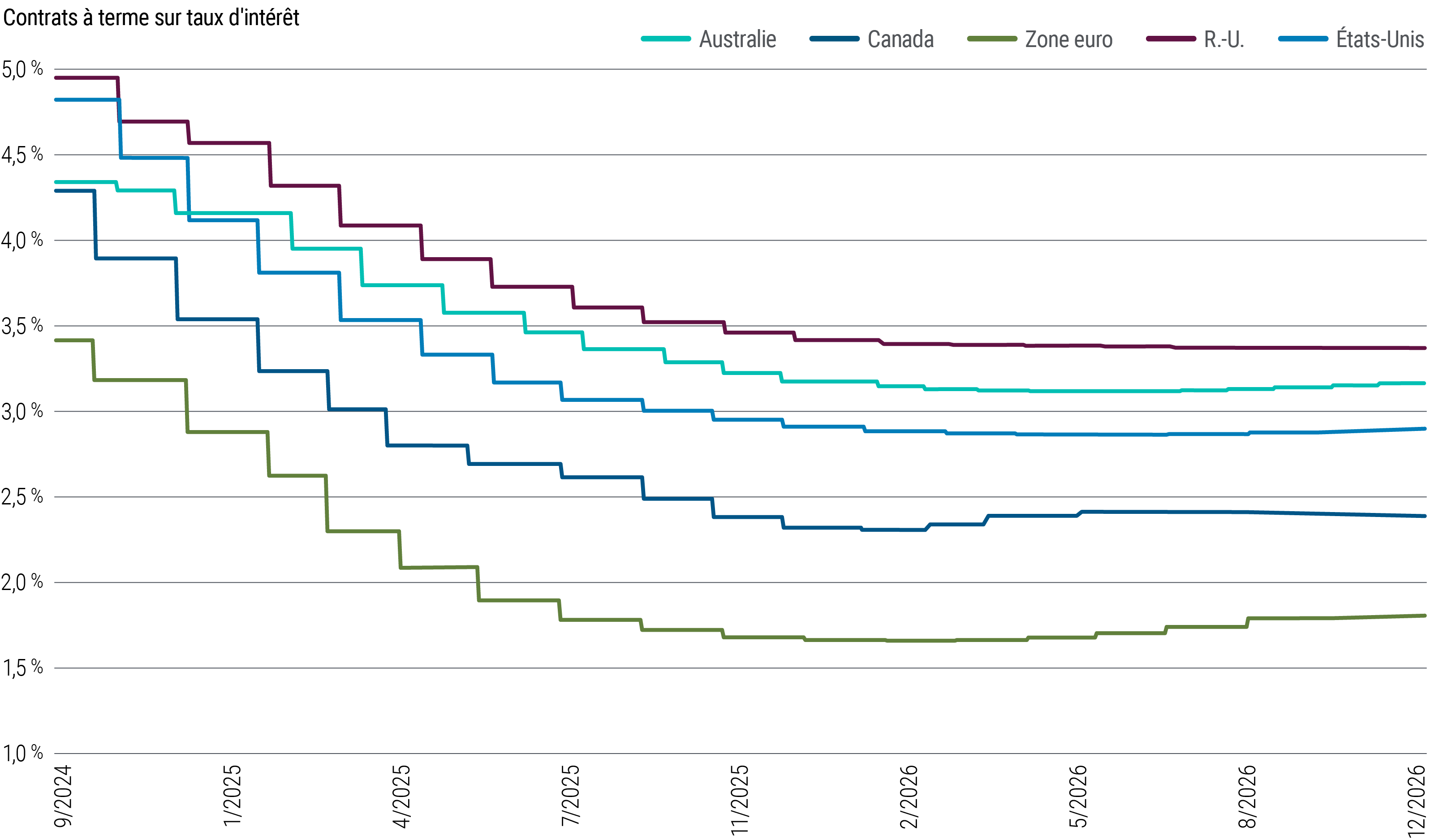 Les courbes de taux devraient selon nous continuer de se pentifier – à l'instar de ce qui s'est produit lors des cycles d'assouplissement précédents – à mesure que la Fed et les autres banques centrales poursuivront leurs baisses des taux à court terme. Bien que la récession ne constitue pas notre scénario de base, les risques économiques demeurent une source d'incertitude dans un contexte de ralentissement de la croissance aux États-Unis. Les risques sont aggravés par les incertitudes entourant les élections américaines qui se profilent, notamment en ce qui concerne les perspectives pour le commerce mondial. Dans ce contexte, il convient d'adopter une approche prudente en matière de dimensionnement des positions et de maintenir la flexibilité des portefeuilles.