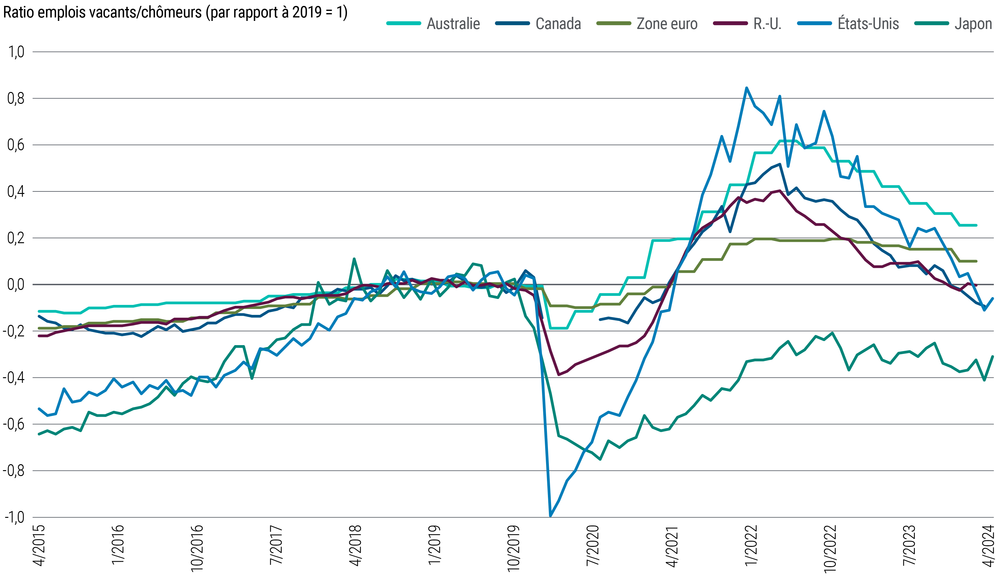 Ailleurs dans le monde développé, la faiblesse de la demande, l'assouplissement des marchés du travail et l'ancrage des anticipations d'inflation présagent également d'un retour de l'inflation autour de l'objectif en 2025. Au Canada, elle pourrait même passer en dessous des niveaux cibles, alors que les indicateurs du marché du travail australiens signalent des progrès plus lents dans le pays.