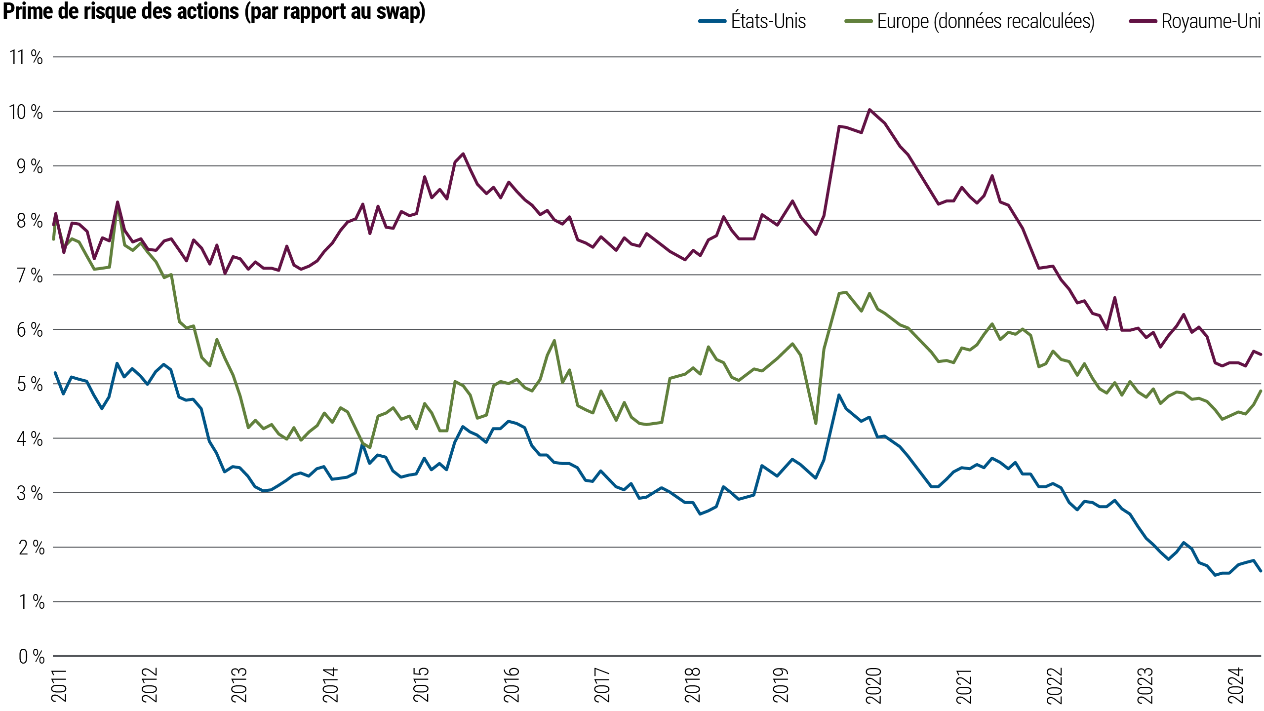 Dans le sillage de la pandémie, les mesures de relance budgétaire sont venues alimenter la reprise économique aux États-Unis tout en propulsant les marchés actions vers des niveaux records. Les actions pourraient certes encore progresser, mais les valorisations semblent plus tendues, la prime de risque des actions américaines – une mesure de la compensation octroyée aux investisseurs en contrepartie de la détention d'actions par rapport au taux sans risque – pointant proche de son niveau plancher (voir la Figure 1).