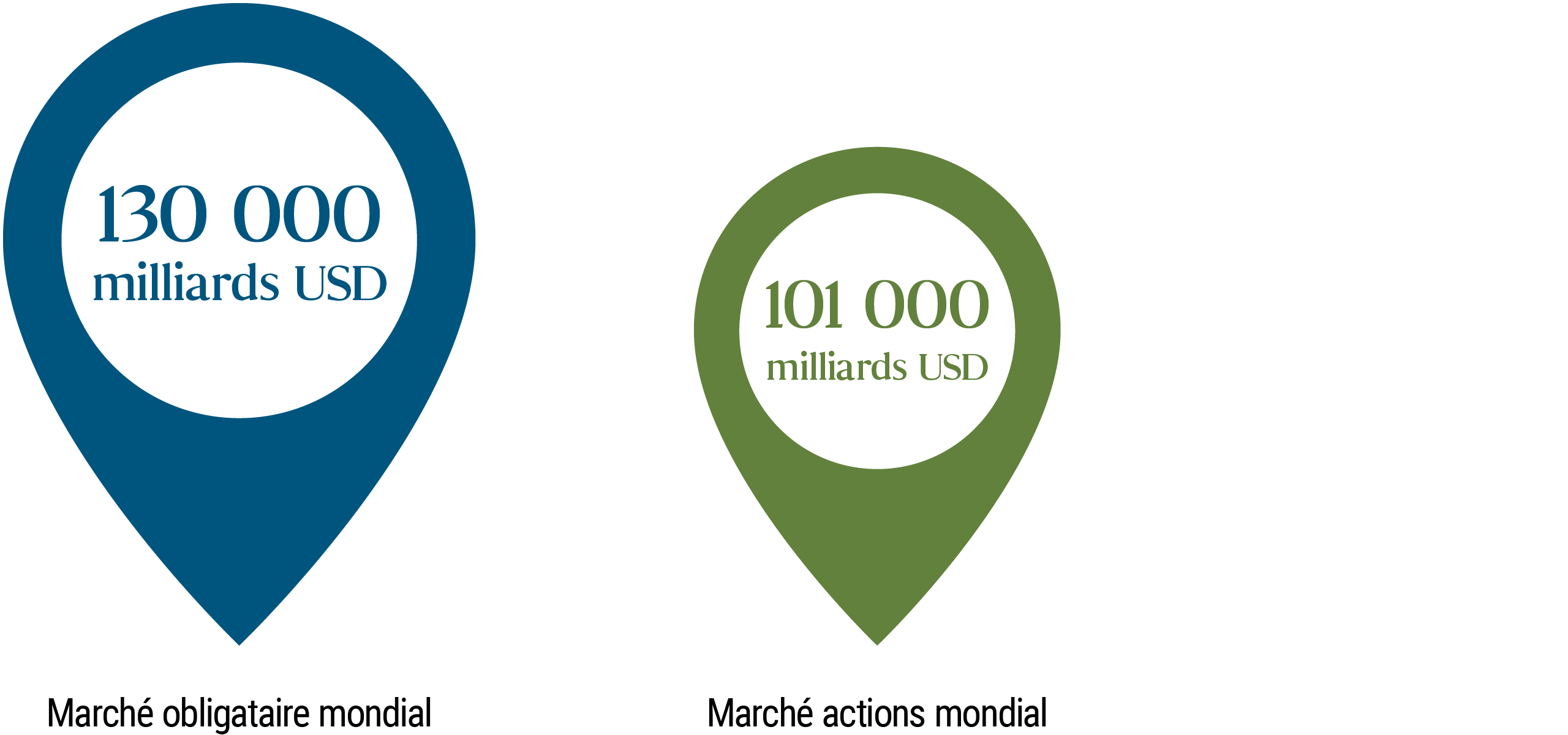 Historiquement, c'est aux États-Unis que le marché obligataire est le plus profond, mais ces dernières années, d'autres marchés se sont développés. Il existe aujourd'hui un marché mondial vaste et sain, évalué autour de 130 000 milliards USD, alors que le marché actions mondial représente quelque 101 000 milliards USD.
