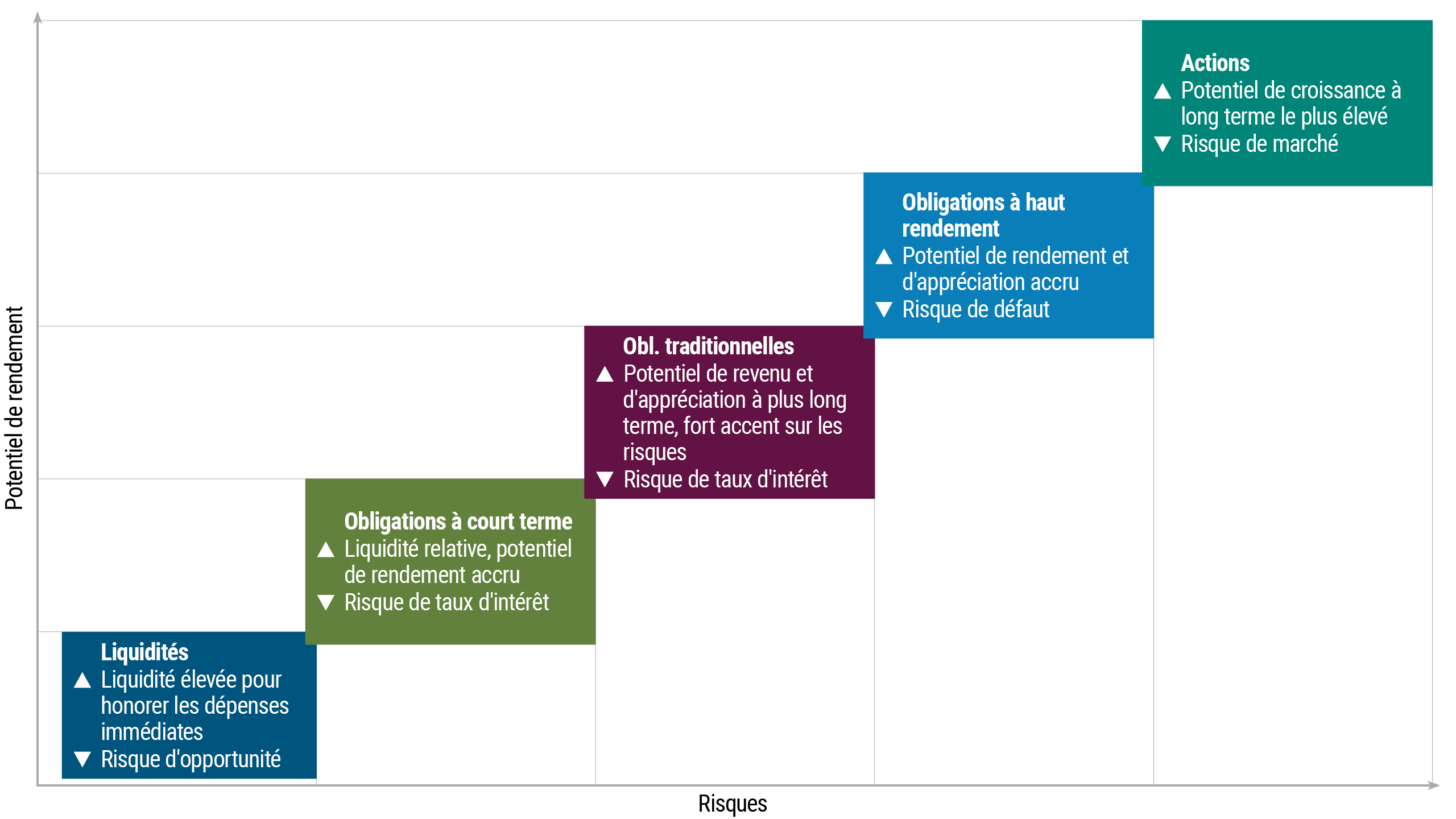 Chaque actif est assorti d'un profil risque/rendement qui lui est propre. Si les liquidités sont considérées comme présentant le moins de risques, elles s'accompagnent également du potentiel de rendement le plus faible. À l'inverse, les actions et les placements alternatifs sont peut-être assortis de risques plus élevés, mais ils offrent également un potentiel de rendement supérieur.